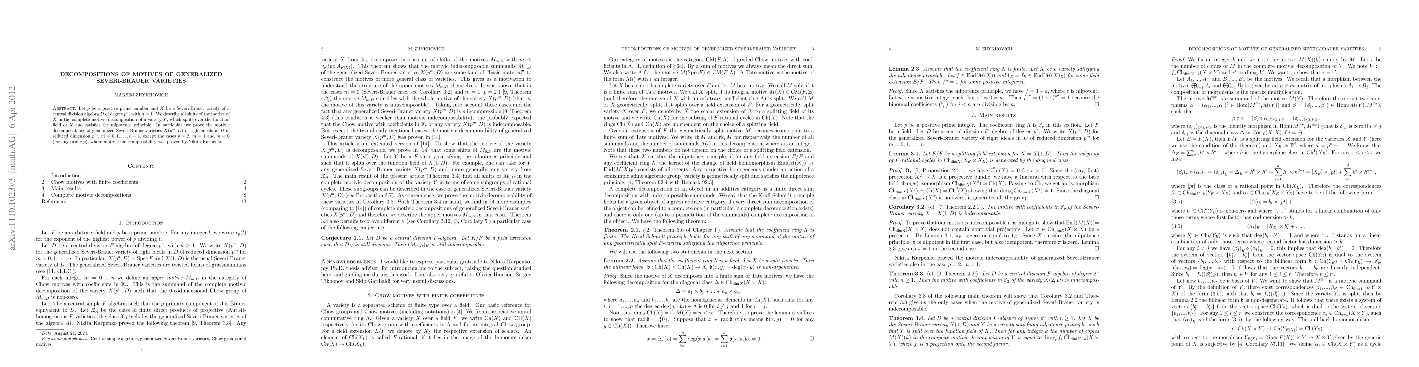Let p be a positive prime number and X be a Severi-Brauer variety of a central division algebra D of degree p^n, with n>0. We describe all shifts of the motive of X in the complete motivic decomposition of a variety Y, which splits over the function field of X and satisfies the nilpotence principle. In particular, we prove the motivic decomposability of generalized Severi-Brauer varieties X(p^m,D) of right ideals in D of reduced dimension p^m, m=0,1,...,n-1, except the cases p=2, m=1 and m=0 (for any prime p), where motivic indecomposability was proven by Nikita Karpenko.