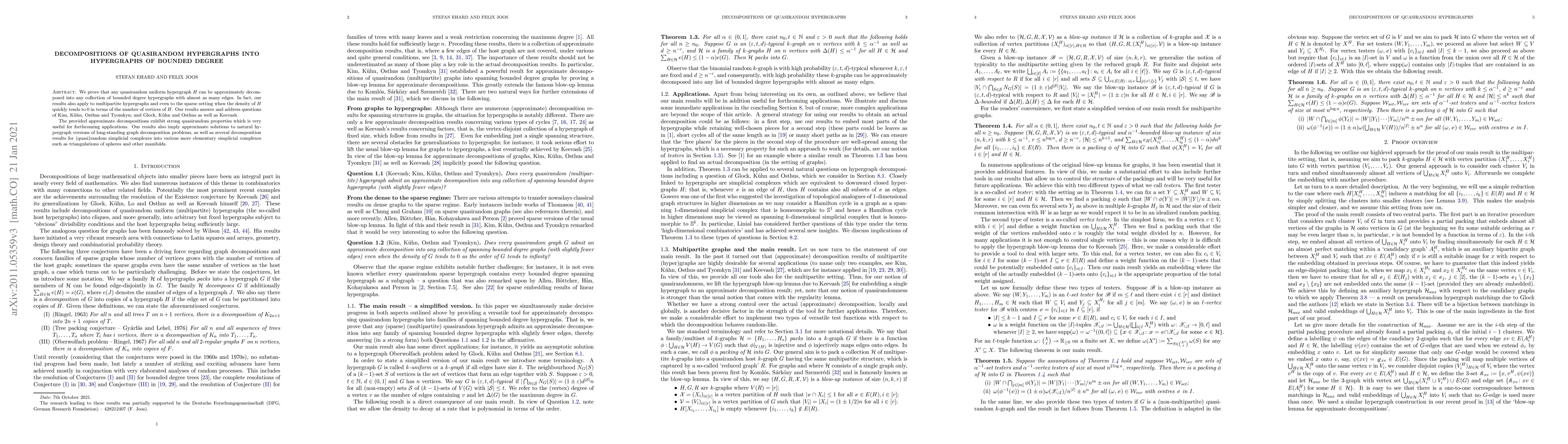 This paper proves that any quasirandom hypergraph can be decomposed into bounded degree hypergraphs while preserving almost all edges, addressing questions posed by several researchers. The decompositions exhibit strong quasirandom properties, useful for future applications and implying solutions to hypergraph versions of long-standing graph decomposition problems.
