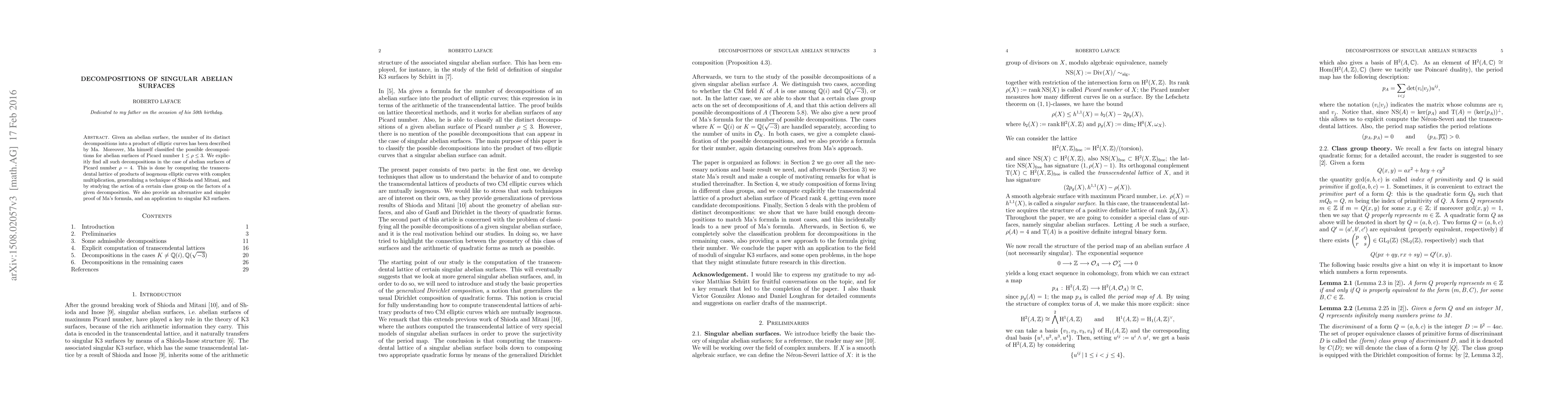 This paper identifies all decompositions of singular abelian surfaces with Picard number 4 into products of elliptic curves, employing techniques from complex multiplication and class group actions. It also offers a simpler proof of Ma's decomposition formula and applies the results to singular K3 surfaces.
