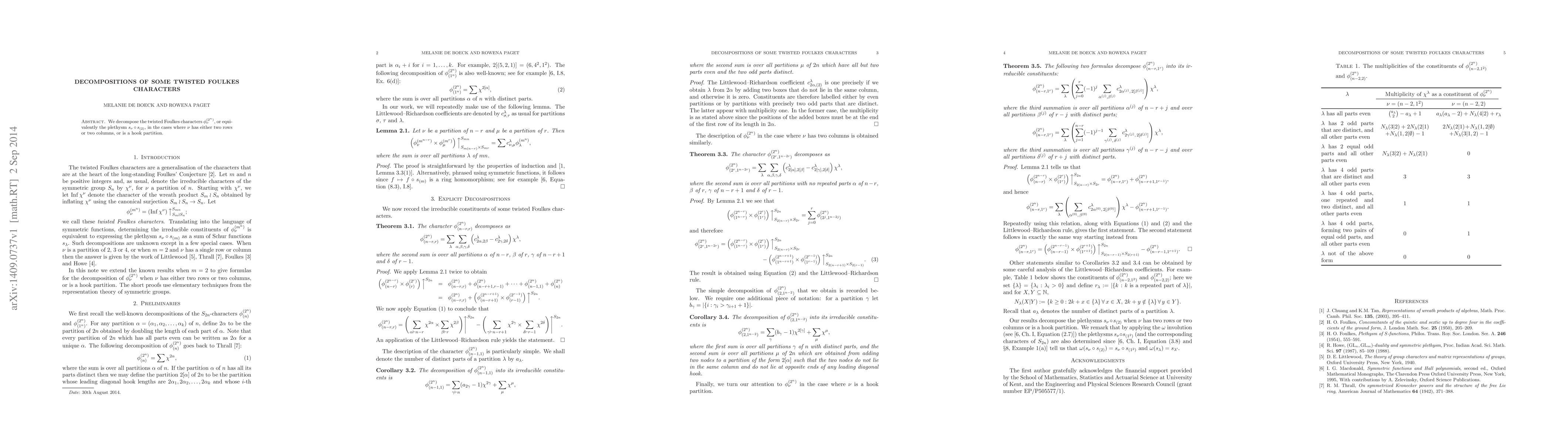 This paper decomposes twisted Foulkes characters $\phi^{(2^n)}_\nu$ for partitions $\nu$ with specific shapes (two rows, two columns, or hook), equivalently analyzing the plethysm $s_\nu \circ s_{(2)}$. The study provides insights into character theory and symmetric function decompositions.