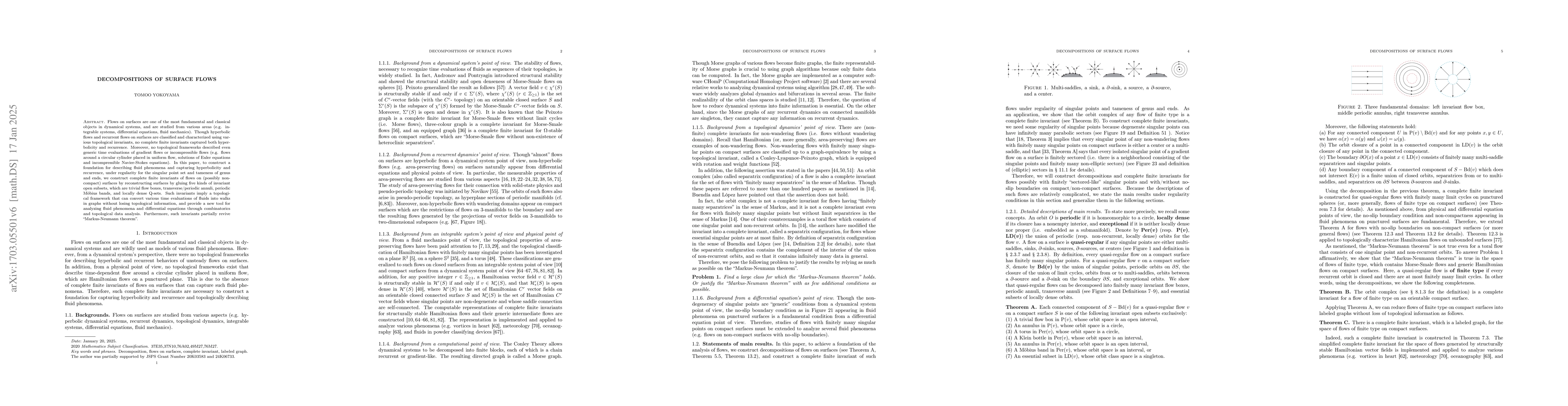 The paper decomposes flows on compact surfaces into four types of invariant subsets and constructs finite complete invariants for specific types of flows, showing that despite uncountable local equivalence classes, finite labelled graphs can enumerate flows with limited types of singularities.