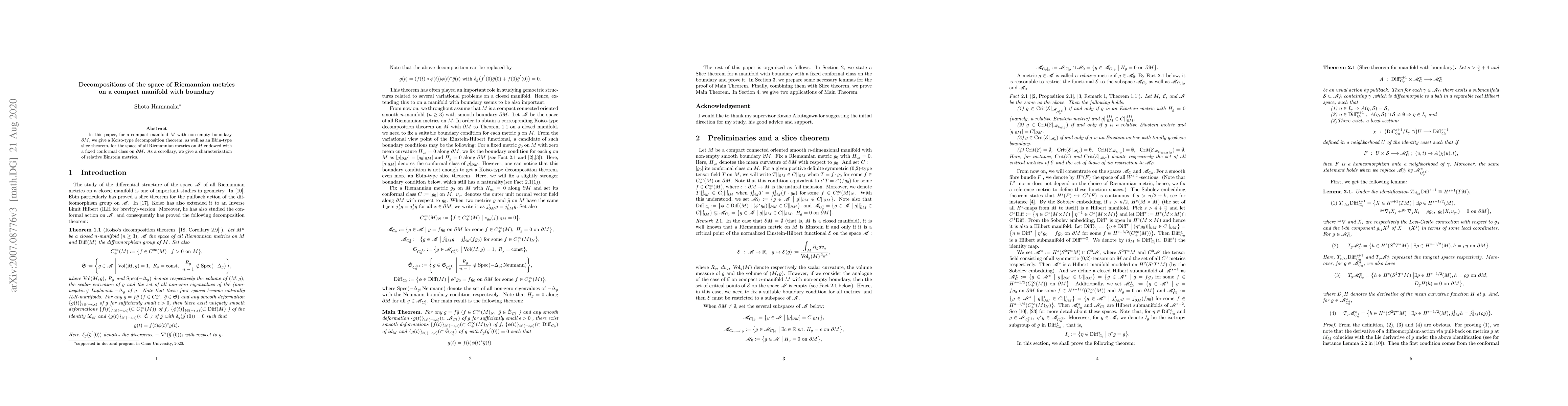 This paper presents a Koiso-type decomposition and an Ebin-type slice theorem for Riemannian metrics on a compact manifold with boundary, within a fixed conformal class, leading to a characterization of relative Einstein metrics.