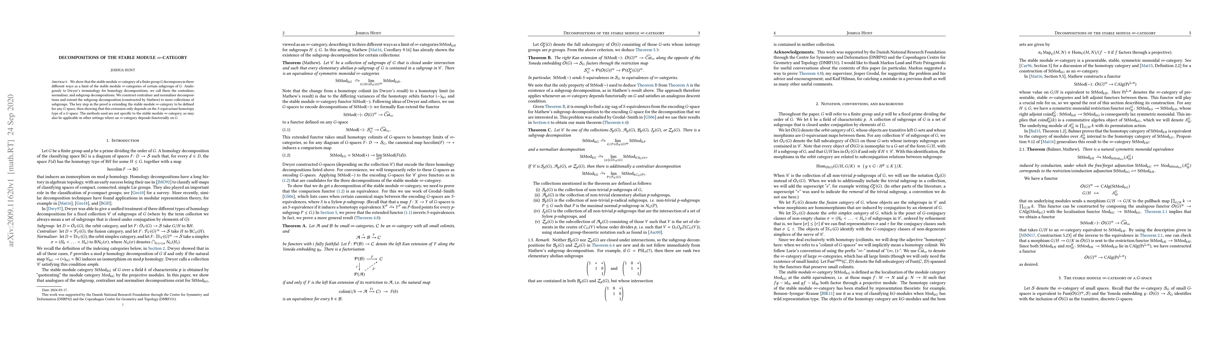 This paper decomposes the stable module $\infty$-category of a finite group $G$ into three types of limits, termed centraliser, normaliser, and subgroup decompositions. These methods, extending beyond the stable module $\infty$-category, may apply to other $\infty$-category settings dependent on $G$.