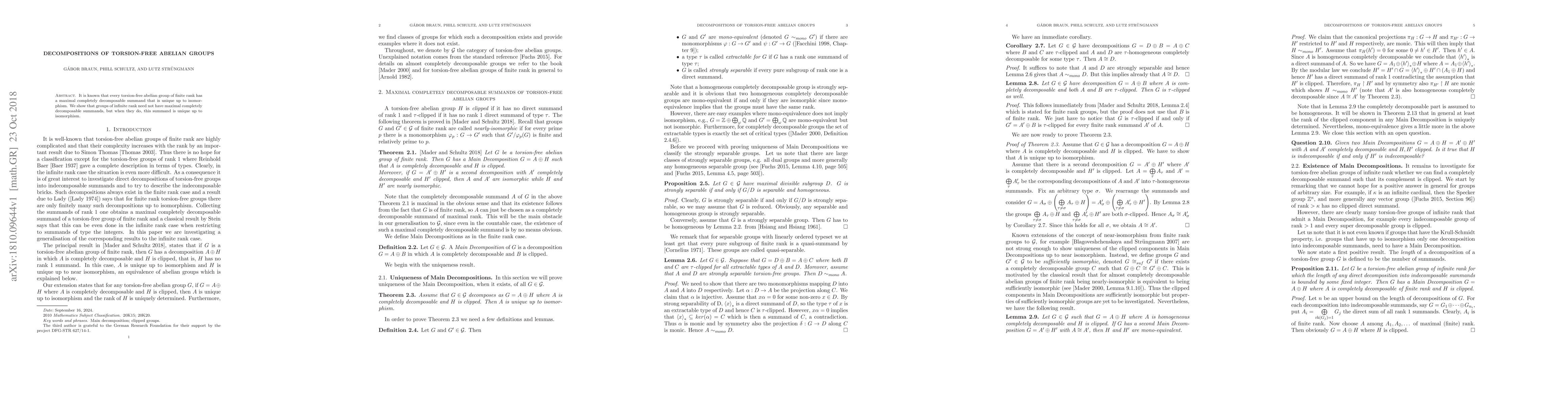 This paper explores the decomposition of torsion-free abelian groups, demonstrating that finite-rank groups possess a unique maximal completely decomposable summand, while infinite-rank groups may lack such summands, though if they do, it is also unique.