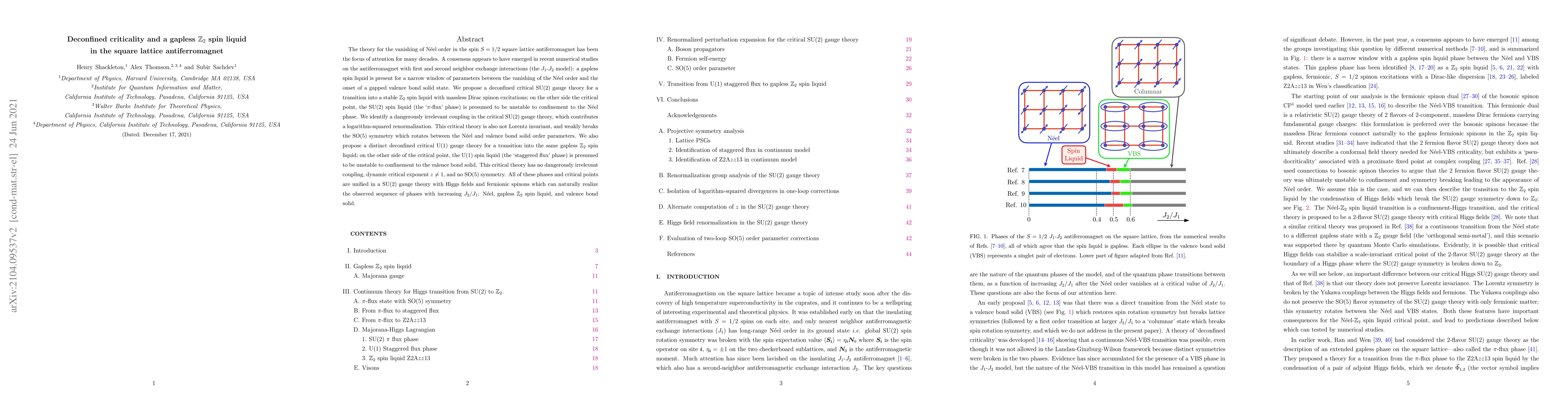 This paper explores the theoretical framework for the $J_1$-$J_2$ model of the spin $S=1/2$ square lattice antiferromagnet, proposing deconfined critical SU(2) and U(1) gauge theories for transitions into a gapless $\mathbb{Z}_2$ spin liquid, with implications for understanding the vanishing of N\'eel order and the emergence of spinon excitations.