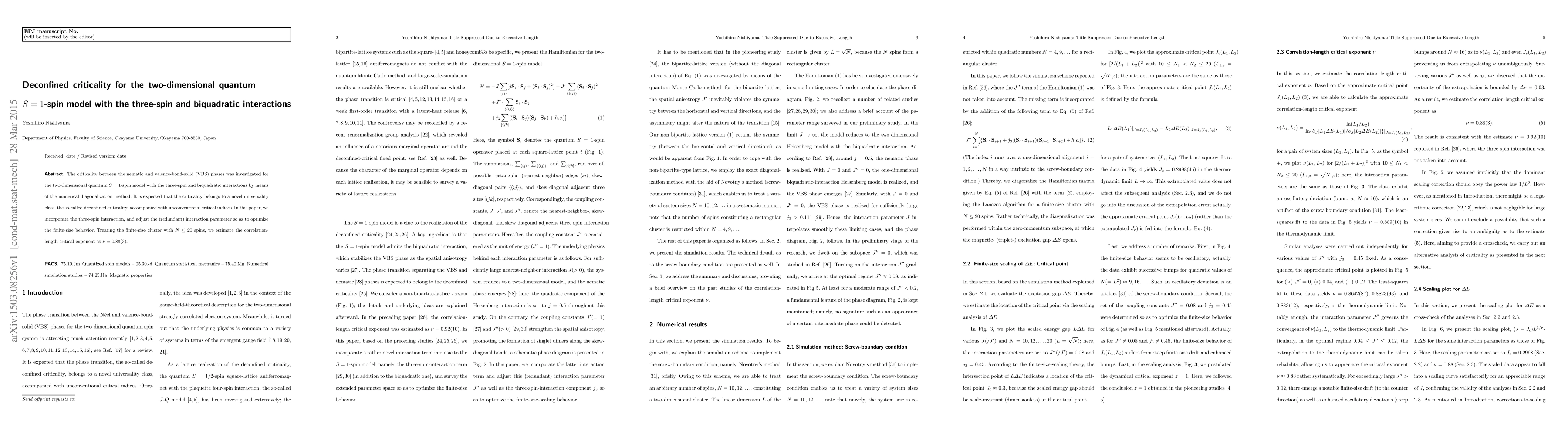 The criticality between the nematic and valence-bond-solid (VBS) phases was investigated for the two-dimensional quantum S=1-spin model with the three-spin and biquadratic interactions by means of the numerical diagonalization method. It is expected that the criticality belongs to a novel universality class, the so-called deconfined criticality, accompanied with unconventional critical indices. In this paper, we incorporate the three-spin interaction, and adjust the (redundant) interaction parameter so as to optimize the finite-size behavior. Treating the finite-size cluster with N \le 20 spins, we estimate the correlation-length critical exponent as \nu=0.88 (3).