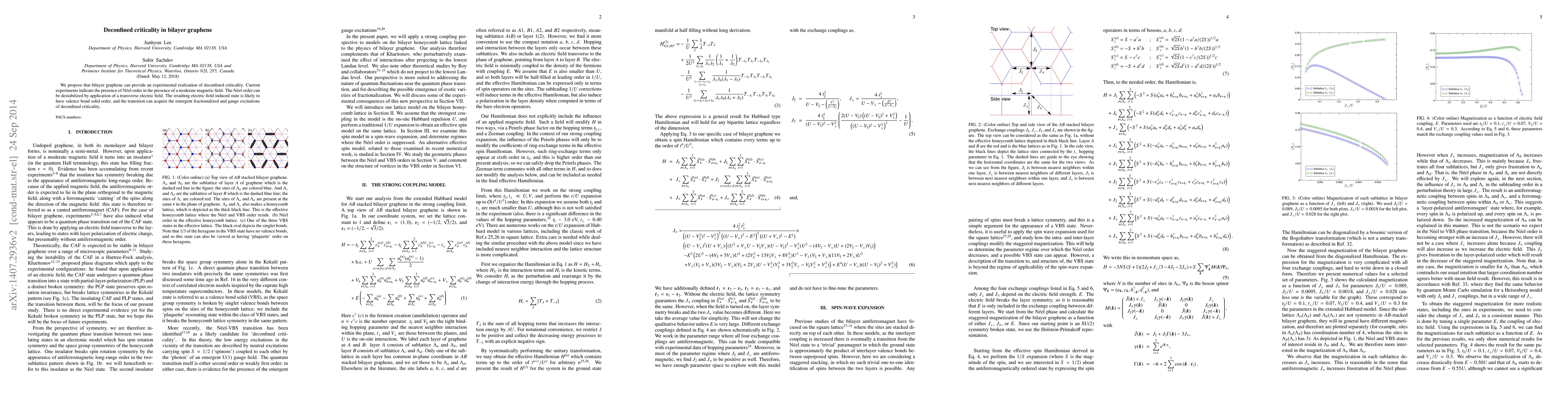 This paper proposes that bilayer graphene can exhibit deconfined criticality, where Néel order in a magnetic field transitions to a valence bond solid state under a transverse electric field, revealing fractionalized and gauge excitations.