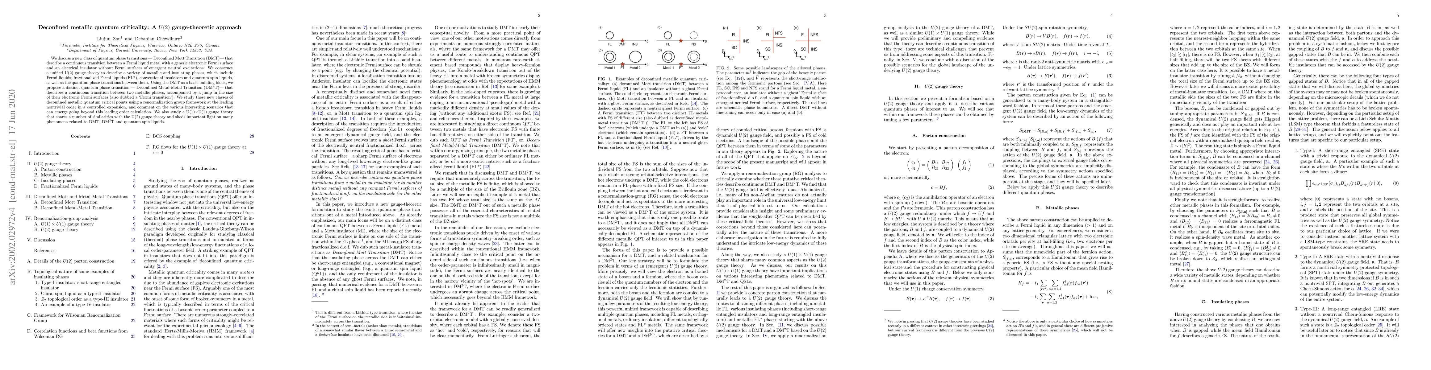 This paper introduces a new class of quantum phase transitions called Deconfined Mott Transition (DMT) and a Deconfined Metal-Metal Transition (DM²T), describing continuous transitions between metallic and insulating states. The authors propose a unified $U(2)$ gauge theory to encompass various metallic and insulating phases, and analyze these transitions using a renormalization group framework.