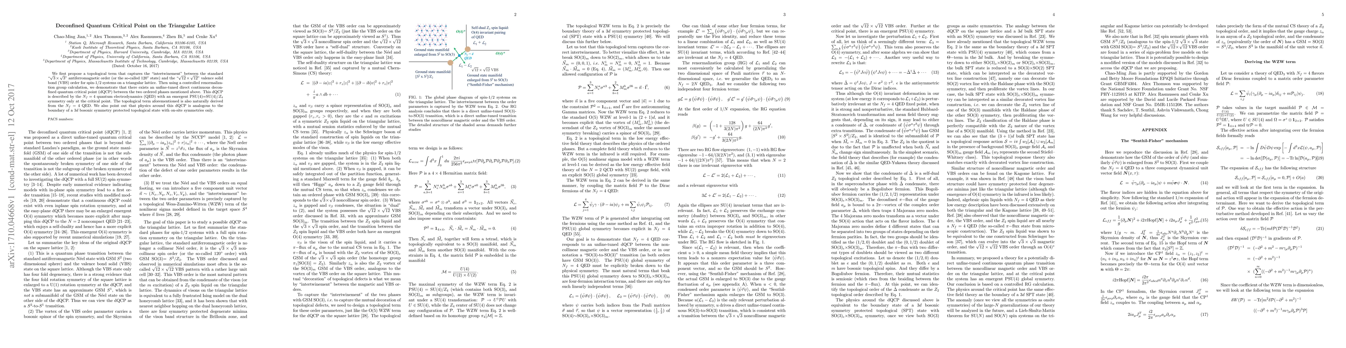 We first propose a topological term that captures the "intertwinement" between the standard "$\sqrt{3} \times \sqrt{3}$" antiferromagnetic order (or the so-called 120$^\circ$ state) and the "$\sqrt{12}\times \sqrt{12}$" valence solid bond (VBS) order for spin-1/2 systems on a triangular lattice. Then using a controlled renormalization group calculation, we demonstrate that there exists an unfine-tuned direct continuous deconfined quantum critical point (dQCP) between the two ordered phases mentioned above. This dQCP is described by the $N_f = 4$ quantum electrodynamics (QED) with an emergent PSU(4)=SU(4)/$Z_4$ symmetry only at the critical point. The topological term aforementioned is also naturally derived from the $N_f = 4 $ QED. We also point out that physics around this dQCP is analogous to the boundary of a $3d$ bosonic symmetry protected topological state with on-site symmetries only.