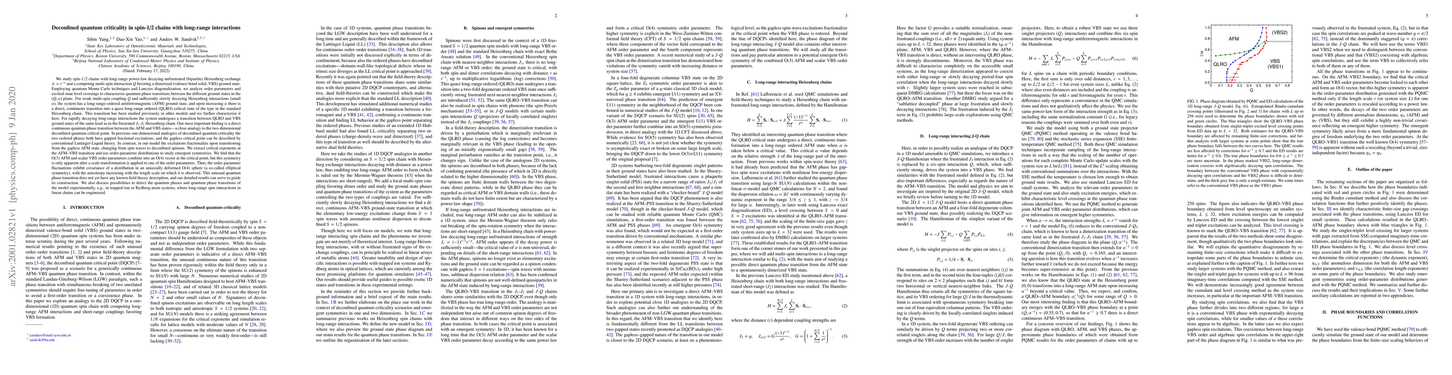 This research investigates spin-$1/2$ chains with long-range interactions transitioning from antiferromagnetic to valence-bond solid states, discovering a continuous quantum phase transition characterized by emergent O($4$) symmetry and deconfined spinons, which lacks a known field theory description.