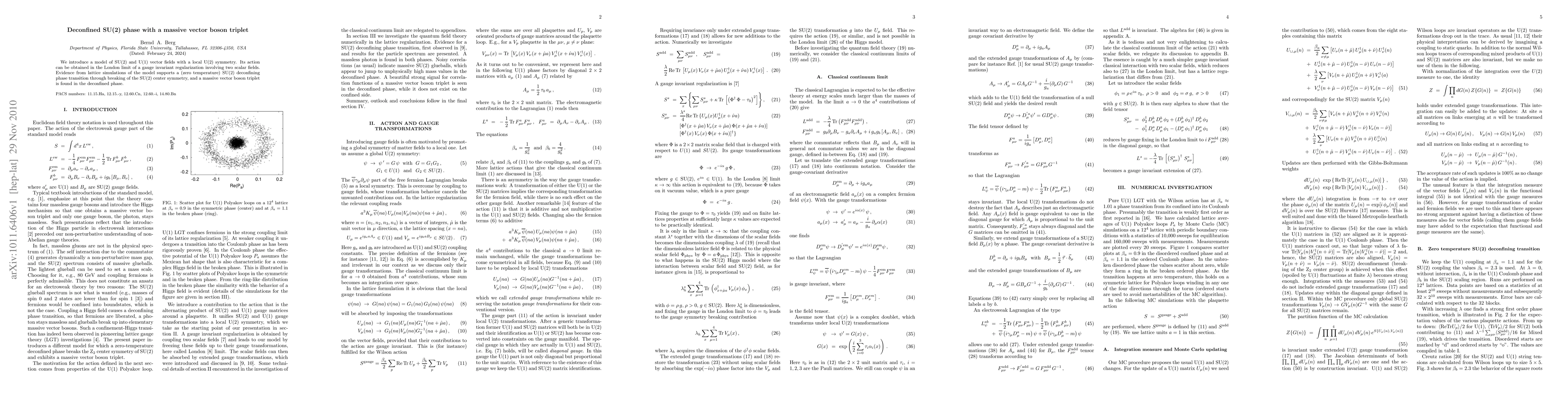 We introduce a model of SU(2) and U(1) vector fields with a local U(2) symmetry. Its action can be obtained in the London limit of a gauge invariant regularization involving two scalar fields. Evidence from lattice simulations of the model supports a (zero temperature) SU(2) deconfining phase transition through breaking of the SU(2) center symmetry, and a massive vector boson triplet is found in the deconfined phase.