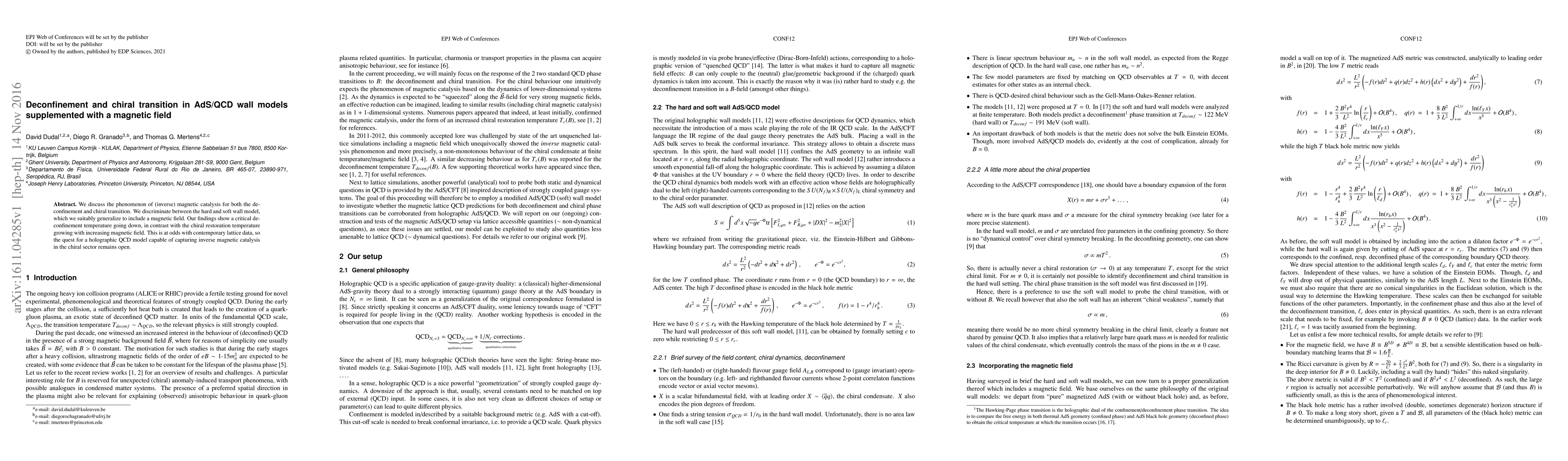 The paper presents a generalization of hard and soft wall AdS/QCD models to include magnetic fields, analyzing deconfinement and chiral transitions, and deriving critical temperatures through the Hawking-Page transition.