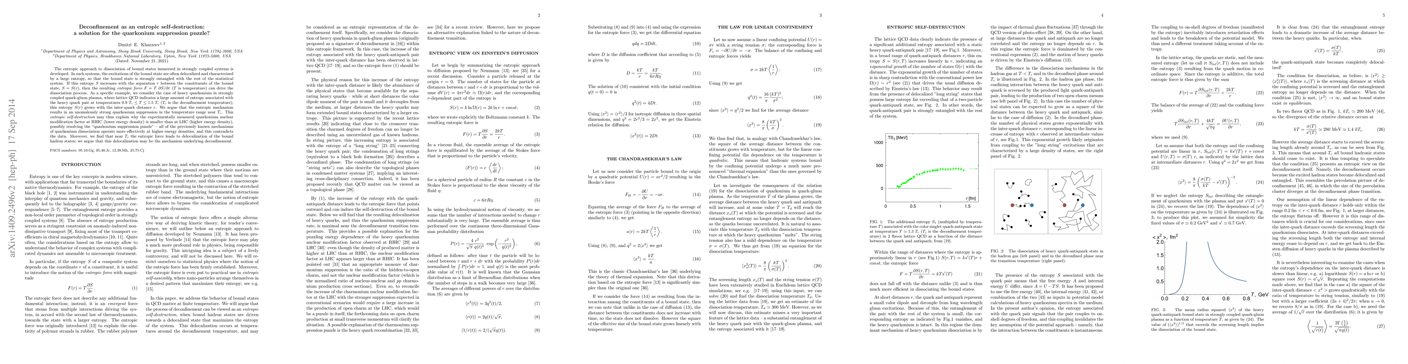 The entropic approach to dissociation of bound states immersed in strongly coupled systems is developed. In such systems, the excitations of the bound state are often delocalized and characterized by a large entropy, so that the bound state is strongly entangled with the rest of the statistical system. If this entropy $S$ increases with the separation $r$ between the constituents of the bound state, $S = S(r)$, then the resulting entropic force $F = T\ {\partial S}/{\partial r}$ ($T$ is temperature) can drive the dissociation process. As a specific example, we consider the case of heavy quarkonium in strongly coupled quark-gluon plasma, where lattice QCD indicates a large amount of entropy associated with the heavy quark pair at temperatures $0.9\ T_c \leq T \leq 1.5\ T_c$ ($T_c$ is the deconfinement temperature); this entropy $S(r)$ grows with the inter-quark distance $r$. We argue that the entropic mechanism results in an anomalously strong quarkonium suppression in the temperature range near $T_c$. This "entropic self-destruction" may thus explain why the experimentally measured quarkonium nuclear modification factor at RHIC (lower energy density) is smaller than at LHC (higher energy density), possibly resolving the "quarkonium suppression puzzle" - all of the previously known mechanisms of quarkonium dissociation operate more effectively at higher energy densities, and this contradicts the data. Moreover, we find that near $T_c$ the entropic force leads to delocalization of the bound hadron states; we argue that this delocalization may be the mechanism underlying deconfinement.