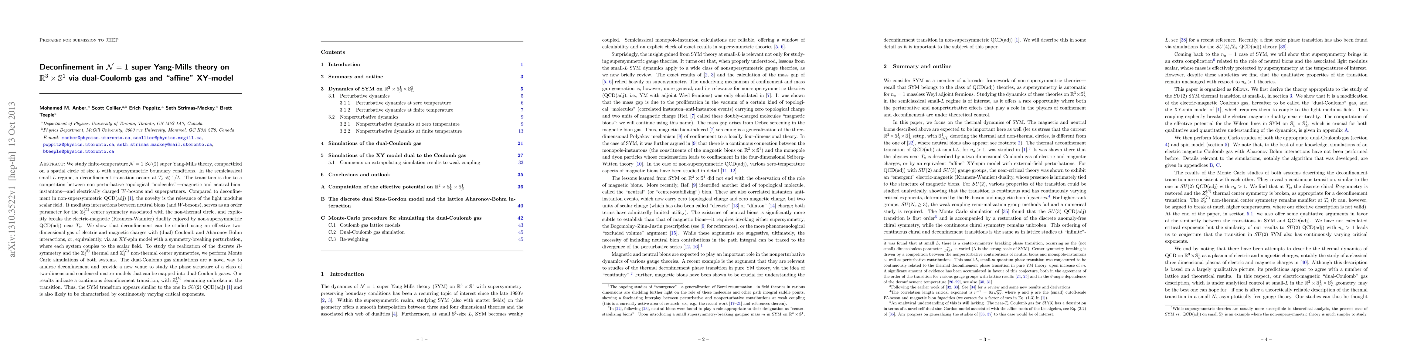 We study finite-temperature N=1 SU(2) super Yang-Mills theory, compactified on a spatial circle of size L with supersymmetric boundary conditions. In the semiclassical small-L regime, a deconfinement transition occurs at T_c <<1/L. The transition is due to a competition between non-perturbative topological "molecules"---magnetic and neutral bion-instantons---and electrically charged W-bosons and superpartners. Compared to deconfinement in non-supersymmetric QCD(adj) arXiv:1112.6389, the novelty is the relevance of the light modulus scalar field. It mediates interactions between neutral bions (and W-bosons), serves as an order parameter for the Z_2^{L} center symmetry associated with the non-thermal circle, and explicitly breaks the electric-magnetic (Kramers-Wannier) duality enjoyed by non-supersymmetric QCD(adj) near T_c. We show that deconfinement can be studied using an effective two-dimensional gas of electric and magnetic charges with (dual) Coulomb and Aharonov-Bohm interactions, or, equivalently, via an XY-spin model with a symmetry-breaking perturbation, where each system couples to the scalar field. To study the realization of the discrete R-symmetry and the Z_2^{beta} thermal and Z_2^{L} non-thermal center symmetries, we perform Monte Carlo simulations of both systems. The dual-Coulomb gas simulations are a novel way to analyze deconfinement and provide a new venue to study the phase structure of a class of two-dimensional condensed matter models that can be mapped into dual-Coulomb gases. Our results indicate a continuous deconfinement transition, with Z_2^{L} remaining unbroken at the transition. Thus, the SYM transition appears similar to the one in SU(2) QCD(adj) arXiv:1112.6389 and is also likely to be characterized by continuously varying critical exponents.
