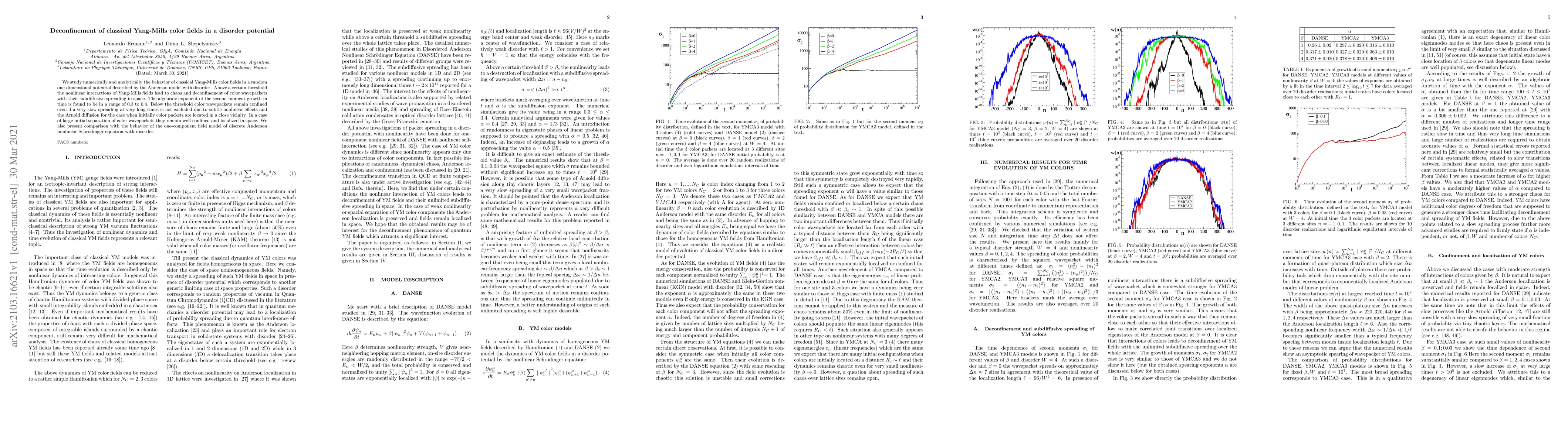 We study numerically and analytically the behavior of classical Yang-Mills color fields in a random one-dimensional potential described by the Anderson model with disorder. Above a certain threshold the nonlinear interactions of Yang-Mills fields lead to chaos and deconfinement of color wavepackets with their subdiffusive spreading in space. The algebraic exponent of the second moment growth in time is found to be in a range of 0.3 to 0.4. Below the threshold color wavepackets remain confined even if a very slow spreading at very long times is not excluded due to subtle nonlinear effects and the Arnold diffusion for the case when initially color packets are located in a close vicinity. In a case of large initial separation of color wavepackets they remain well confined and localized in space. We also present comparison with the behavior of the one-component field model of discrete Anderson nonlinear Schr\"odinger equation with disorder.