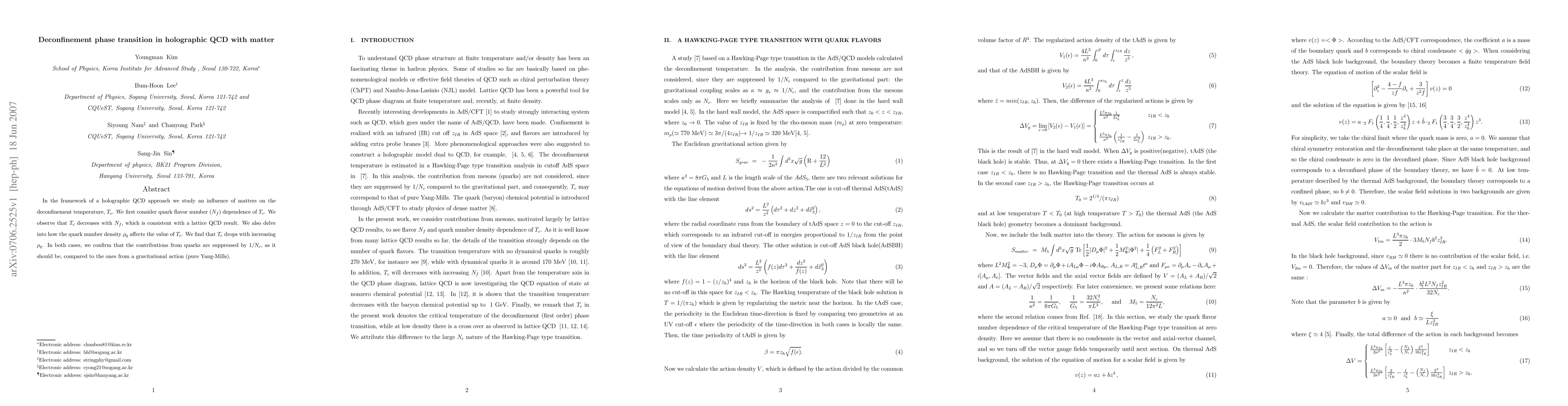 In the framework of a holographic QCD approach we study an influence of matters on the deconfinement temperature, $T_c$. We first consider quark flavor number ($N_f$) dependence of $T_c$. We observe that $T_c$ decreases with $N_f$, which is consistent with a lattice QCD result. We also delve into how the quark number density $\rho_q$ affects the value of $T_c$. We find that $T_c$ drops with increasing $\rho_q$. In both cases, we confirm that the contributions from quarks are suppressed by $1/N_c$, as it should be, compared to the ones from a gravitational action (pure Yang-Mills).