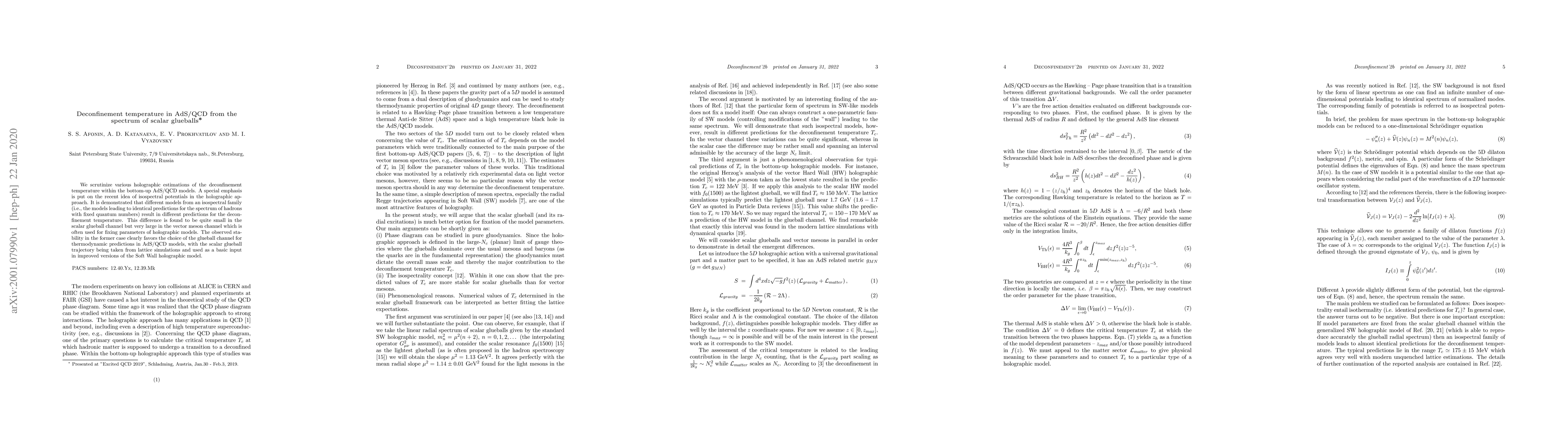 This paper examines the deconfinement temperature in AdS/QCD models, focusing on the spectrum of scalar glueballs. It finds that while different models within an isospectral family predict varying deconfinement temperatures, the differences are minimal for scalar glueballs but significant for vector mesons, suggesting scalar glueballs provide a more stable basis for thermodynamic predictions in AdS/QCD.