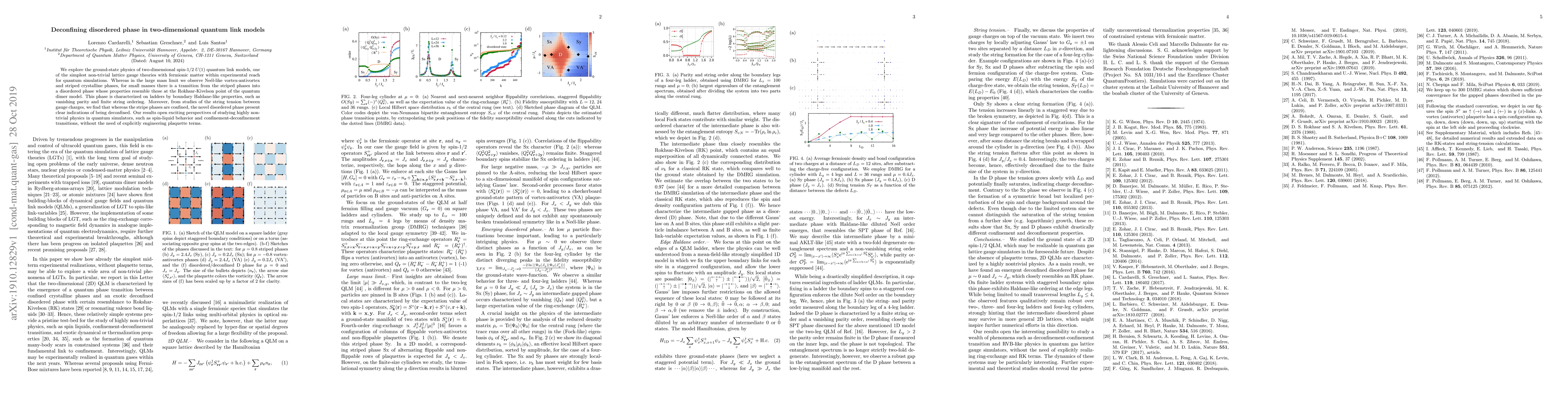 We explore the ground-state physics of two-dimensional spin-$1/2$ $U(1)$ quantum link models, one of the simplest non-trivial lattice gauge theories with fermionic matter within experimental reach for quantum simulations. Whereas in the large mass limit we observe Ne\'el-like vortex-antivortex and striped crystalline phases, for small masses there is a transition from the striped phases into a disordered phase whose properties resemble those at the Rokhsar-Kivelson point of the quantum dimer model. This phase is characterized on ladders by boundary Haldane-like properties, such as vanishing parity and finite string ordering. Moreover, from studies of the string tension between gauge charges, we find that whereas the stripe phases are confined, the novel disordered phase present clear indications of being deconfined. Our results open exciting perspectives of studying highly non-trivial physics in quantum simulators, such as spin-liquid behavior and confinement-deconfinement transitions, without the need of explicitly engineering plaquette terms.