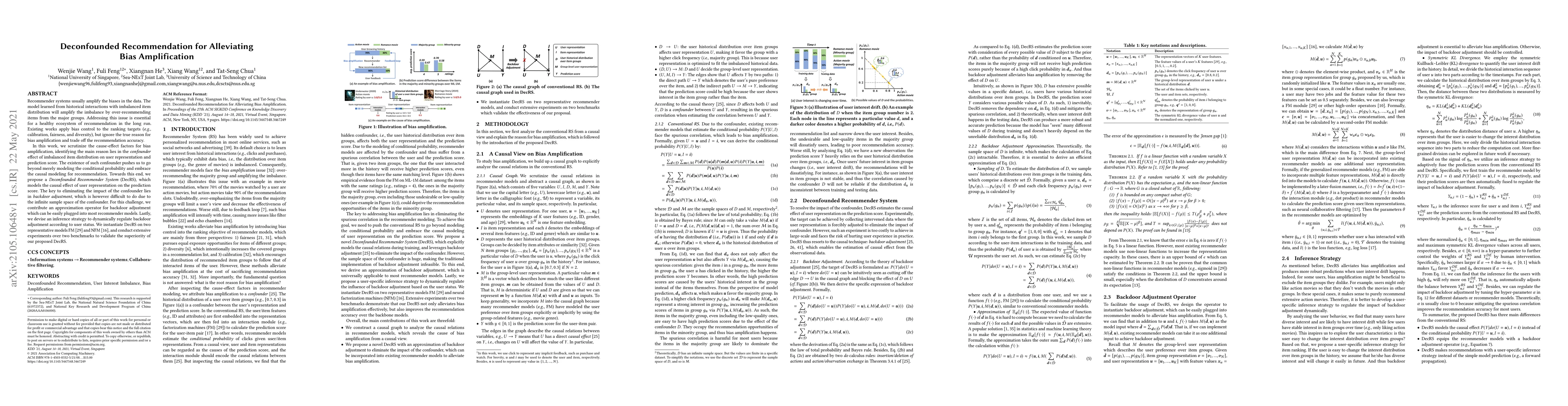 This paper proposes a Deconfounded Recommender System (DecRS) to mitigate bias amplification in recommender systems caused by the confounder effect of imbalanced item distribution. It introduces a causal modeling approach and an approximation operator for backdoor adjustment to eliminate the confounder's impact, validated through experiments on FM and NFM models.