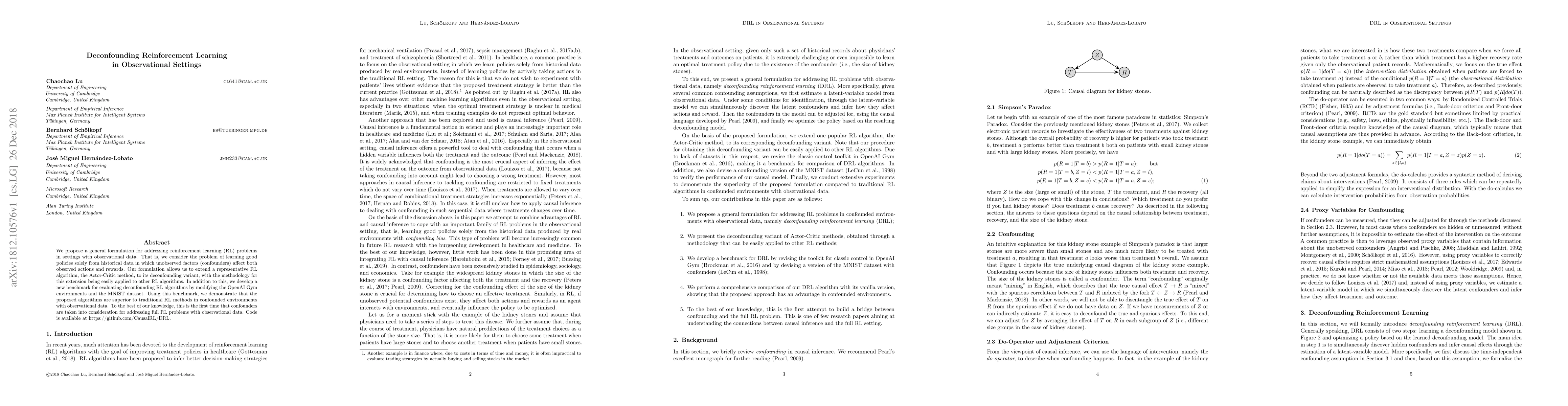 This paper introduces a novel approach to reinforcement learning in observational settings by addressing confounders, proposing a deconfounding extension of the Actor-Critic method. It also creates a new benchmark using modified environments and datasets to evaluate the effectiveness of the proposed algorithms, demonstrating their superiority over traditional RL methods.