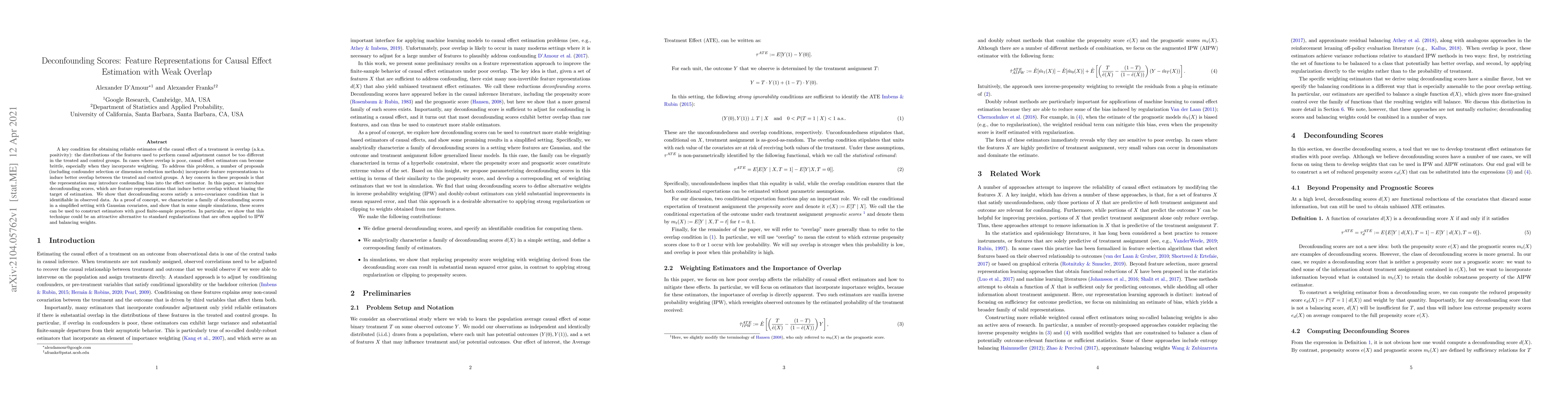 This paper introduces deconfounding scores, a novel feature representation method designed to improve causal effect estimation in scenarios with weak overlap between treated and control groups. The proposed method satisfies a zero-covariance condition to avoid introducing confounding bias, demonstrating effective performance in simple simulations.