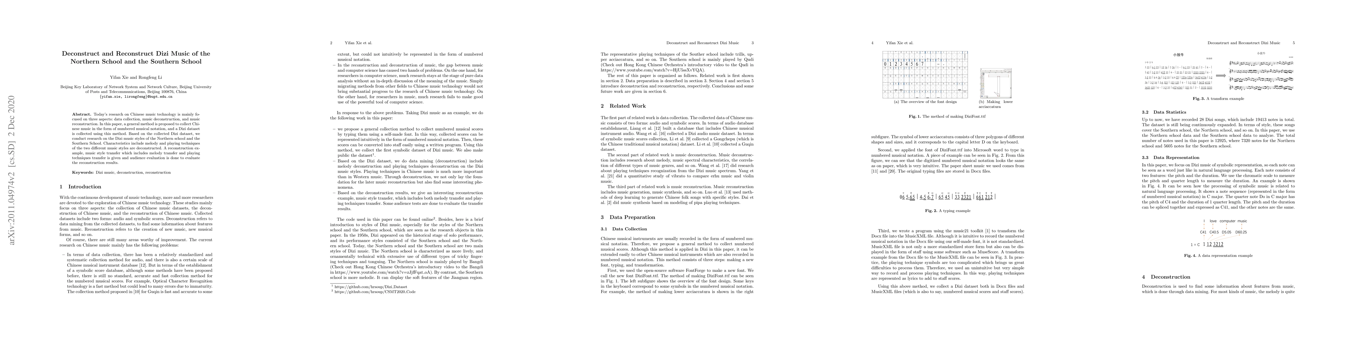 Today's research on Chinese music technology is mainly focused on three aspects: data collection, music deconstruction, and music reconstruction. In this paper, a general method is proposed to collect Chinese music in the form of numbered musical notation, and a Dizi dataset is collected using this method. Based on the collected Dizi dataset, we conduct research on the Dizi music styles of the Northern school and the Southern School. Characteristics include melody and playing techniques of the two different music styles are deconstructed. A reconstruction example, music style transfer which includes melody transfer and playing techniques transfer is given and audience evaluation is done to evaluate the reconstruction results.