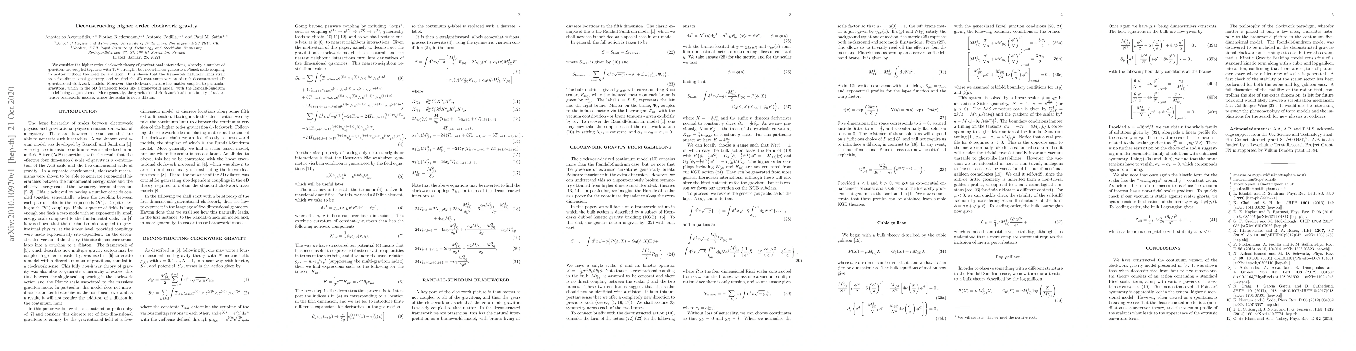 This paper explores a higher order clockwork theory of gravity where multiple gravitons with TeV strength generate a Planck scale coupling to matter without a dilaton. The study finds that this framework naturally fits into a five-dimensional geometry, leading to a continuum version of 4D gravitational clockwork models and a family of scalar-tensor braneworld models, distinct from the usual Randall-Sundrum model.