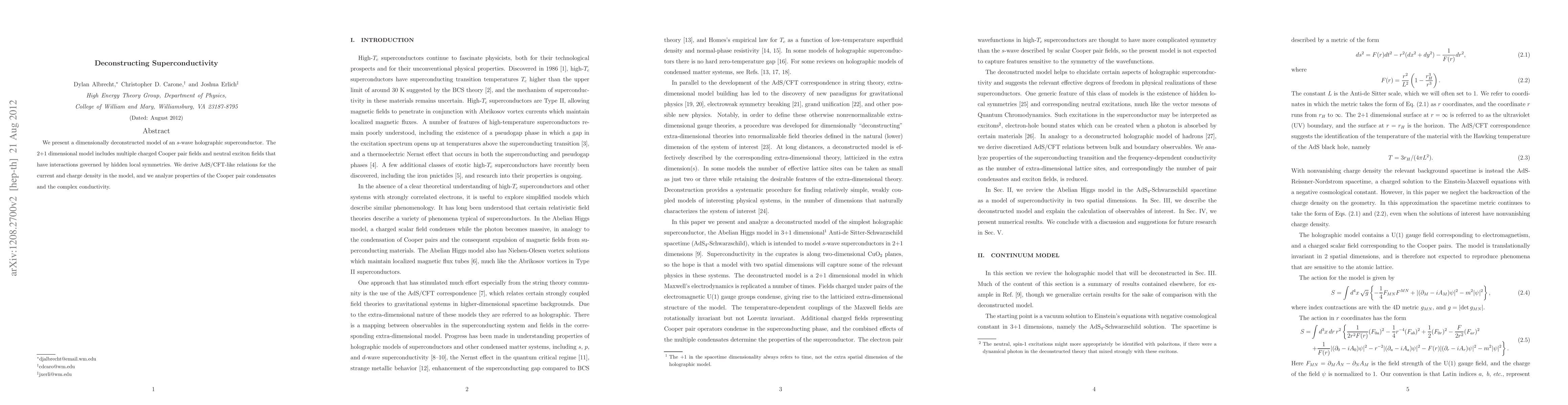 We present a dimensionally deconstructed model of an s-wave holographic superconductor. The 2+1 dimensional model includes multiple charged Cooper pair fields and neutral exciton fields that have interactions governed by hidden local symmetries. We derive AdS/CFT-like relations for the current and charge density in the model, and we analyze properties of the Cooper pair condensates and the complex conductivity.