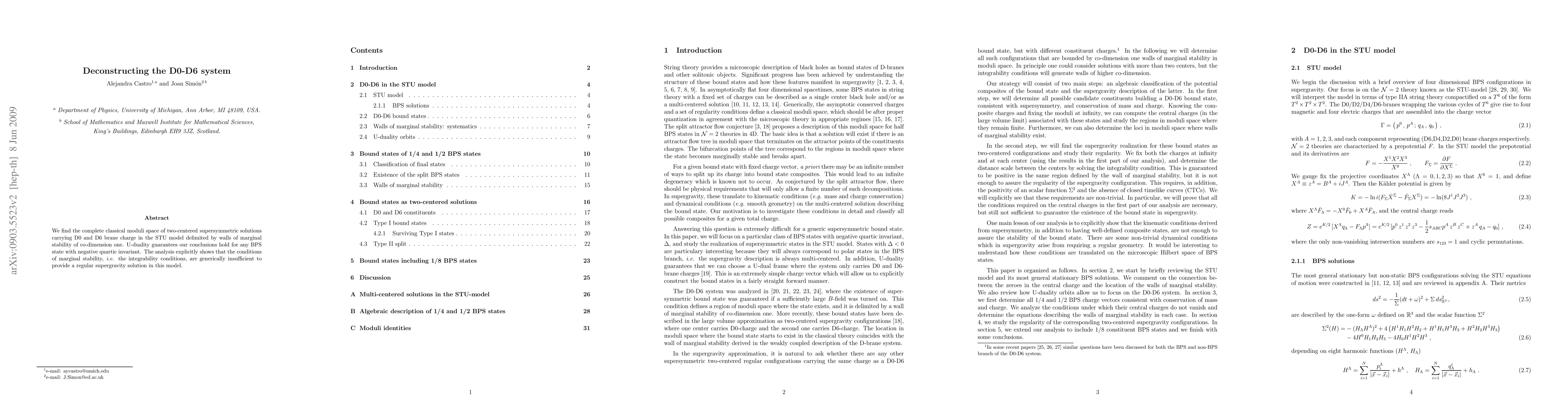 We find the complete classical moduli space of two-centered supersymmetric solutions carrying D0 and D6 brane charge in the STU model delimited by walls of marginal stability of co-dimension one. U-duality guarantees our conclusions hold for any BPS state with negative quartic invariant. The analysis explicitly shows that the conditions of marginal stability, i.e. the integrability conditions, are generically insufficient to provide a regular supergravity solution in this model.