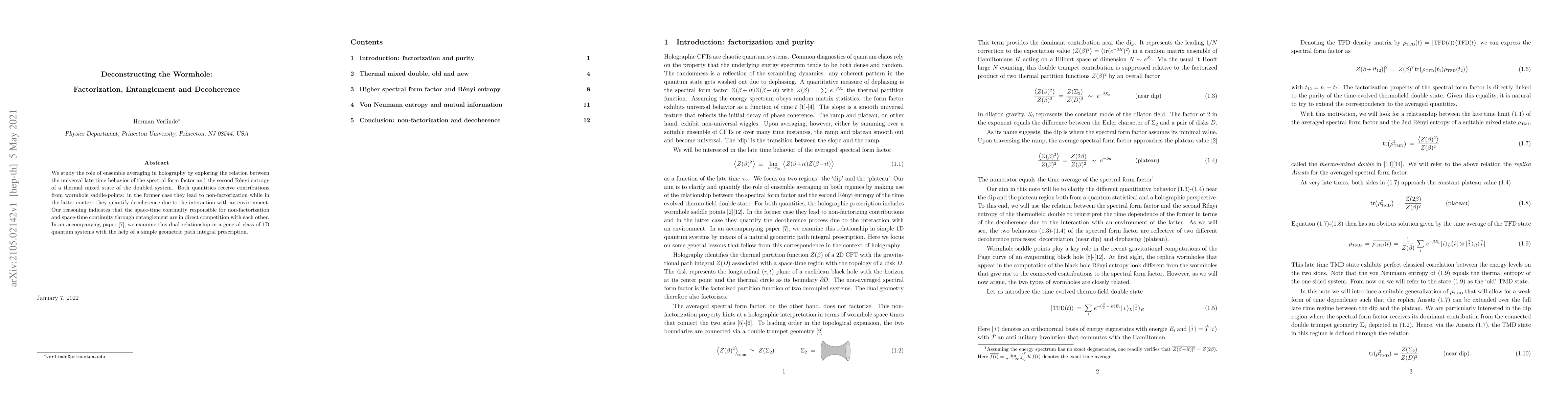 We study the role of ensemble averaging in holography by exploring the relation between the universal late time behavior of the spectral form factor and the second Renyi entropy of a thermal mixed state of the doubled system. Both quantities receive contributions from wormhole saddle-points: in the former case they lead to non-factorization while in the latter context they quantify decoherence due to the interaction with an environment. Our reasoning indicates that the space-time continuity responsible for non-factorization and space-time continuity through entanglement are in direct competition with each other. In an accompanying paper, we examine this dual relationship in a general class of 1D quantum systems with the help of a simple geometric path integral prescription.