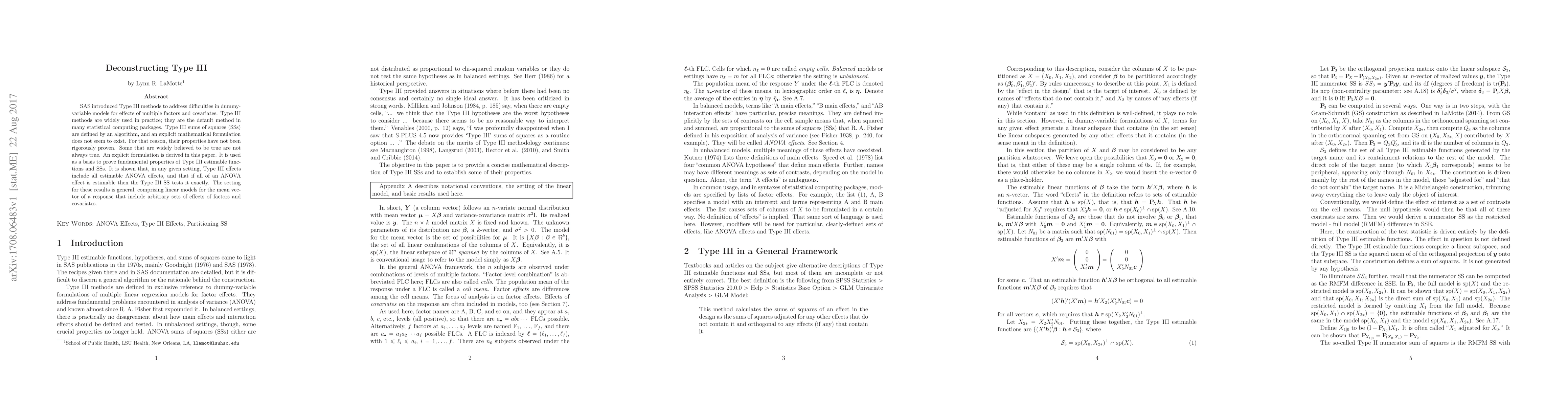SAS introduced Type III methods to address difficulties in dummy-variable models for effects of multiple factors and covariates. Type III methods are widely used in practice; they are the default method in many statistical computing packages. Type III sums of squares (SSs) are defined by an algorithm, and an explicit mathematical formulation does not seem to exist. For that reason, their properties have not been rigorously proven. Some that are widely believed to be true are not always true. An explicit formulation is derived in this paper. It is used as a basis to prove fundamental properties of Type III estimable functions and SSs. It is shown that, in any given setting, Type III effects include all estimable ANOVA effects, and that if all of an ANOVA effect is estimable then the Type III SS tests it exactly. The setting for these results is general, comprising linear models for the mean vector of a response that include arbitrary sets of effects of factors and covariates.