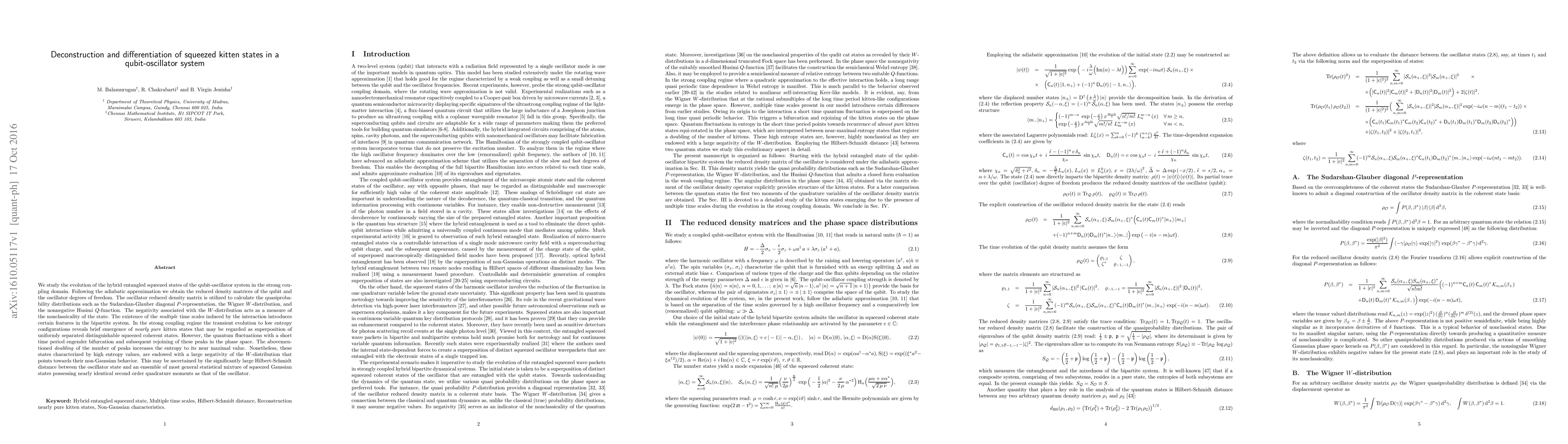 We study the evolution of the hybrid entangled squeezed states of the qubit-oscillator system in the strong coupling domain. Following the adiabatic approximation we obtain the reduced density matrices of the qubit and the oscillator degrees of freedom. The oscillator reduced density matrix is utilized to calculate the quasiprobability distributions such as the Sudarshan-Glauber diagonal P -representation, the Wigner W -distribution, and the nonnegative Husimi Q-function. The negativity associated with the W -distribution acts as a measure of the nonclassicality of the state. The existence of the multiple time scales induced by the interaction introduces certain features in the bipartite system. In the strong coupling regime the transient evolution to low entropy configurations reveals brief emergence of nearly pure kitten states that may be regarded as superposition of uniformly separated distinguishable squeezed coherent states. However, the quantum fluctuations with a short time period engender bifurcation and subsequent rejoining of these peaks in the phase space. The abovementioned doubling of the number of peaks increases the entropy to its near maximal value. Nonetheless, these states characterized by high entropy values, are endowed with a large negativity of the W -distribution that points towards their non-Gaussian behavior. This may be ascertained by the significantly large Hilbert-Schmidt distance between the oscillator state and an ensemble of most general statistical mixture of squeezed Gaussian states possessing nearly identical second order quadrature moments as that of the oscillator.