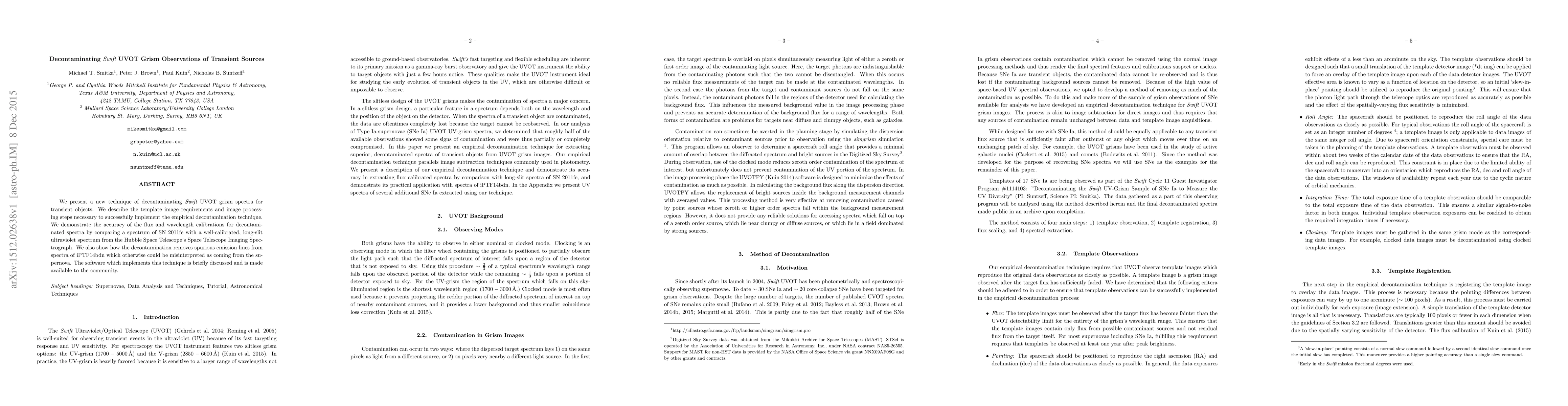 This paper introduces a new method for decontaminating Swift UVOT grism spectra of transient objects, detailing the necessary template image requirements and image processing steps. The technique's effectiveness is validated by comparing decontaminated spectra of SN 2011fe with HST's STIS data, and it successfully removes spurious lines from iPTF14bdn spectra.
