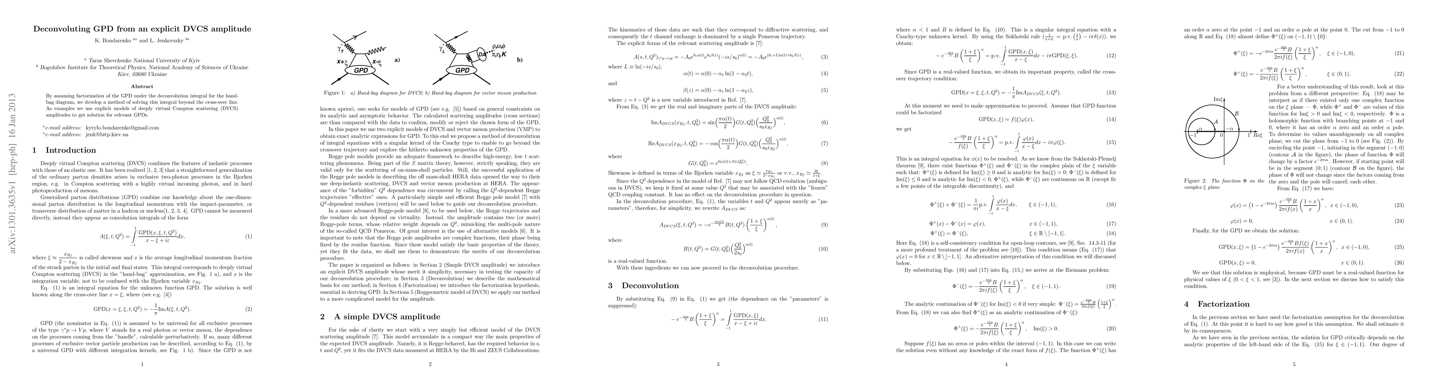 By assuming factorization of the GPD under the deconvolution integral for the hand-bag diagram, we develop a method of solving this integral beyond the cross-over line. As examples we use explicit models of deeply virtual Compton scattering (DVCS) amplitudes to get solution for relevant GPDs.