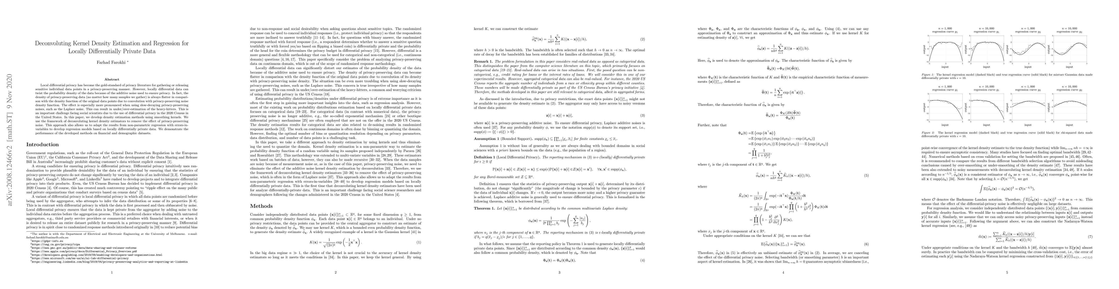 This paper proposes deconvolution methods to estimate density and develop regression models for locally differentially private data, addressing the issue of noise-induced density flattening and its impact on heavy-hitter estimation. The developed techniques are demonstrated on financial and demographic datasets.