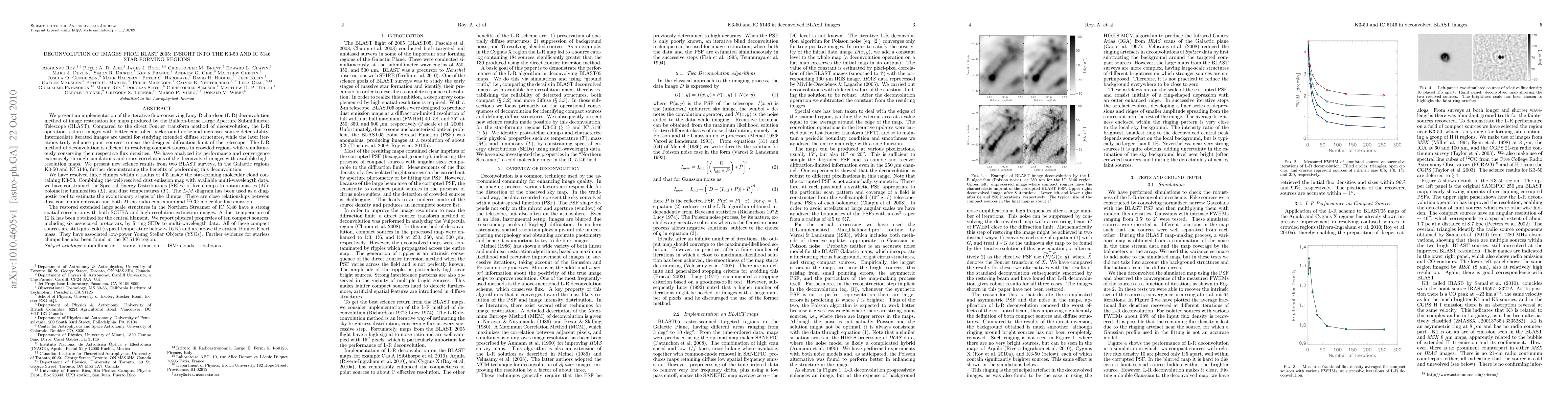 We present an implementation of the iterative flux-conserving Lucy-Richardson (L-R) deconvolution method of image restoration for maps produced by the Balloon-borne Large Aperture Submillimeter Telescope (BLAST). We have analyzed its performance and convergence extensively through simulations and cross-correlations of the deconvolved images with available highresolution maps. We present new science results from two BLAST surveys, in the Galactic regions K3-50 and IC 5146, further demonstrating the benefits of performing this deconvolution. We have resolved three clumps within a radius of 4.'5 inside the star-forming molecular cloud containing K3-50. Combining the well-resolved dust emission map with available multi-wavelength data, we have constrained the Spectral Energy Distributions (SEDs) of five clumps to obtain masses (M), bolometric luminosities (L), and dust temperatures (T). The L-M diagram has been used as a diagnostic tool to estimate the evolutionary stages of the clumps. There are close relationships between dust continuum emission and both 21-cm radio continuum and 12CO molecular line emission. The restored extended large scale structures in the Northern Streamer of IC 5146 have a strong spatial correlation with both SCUBA and high resolution extinction images. A dust temperature of 12 K has been obtained for the central filament. We report physical properties of ten compact sources, including six associated protostars, by fitting SEDs to multi-wavelength data. All of these compact sources are still quite cold (typical temperature below ~ 16 K) and are above the critical Bonner-Ebert mass. They have associated low-power Young Stellar Objects (YSOs). Further evidence for starless clumps has also been found in the IC 5146 region.