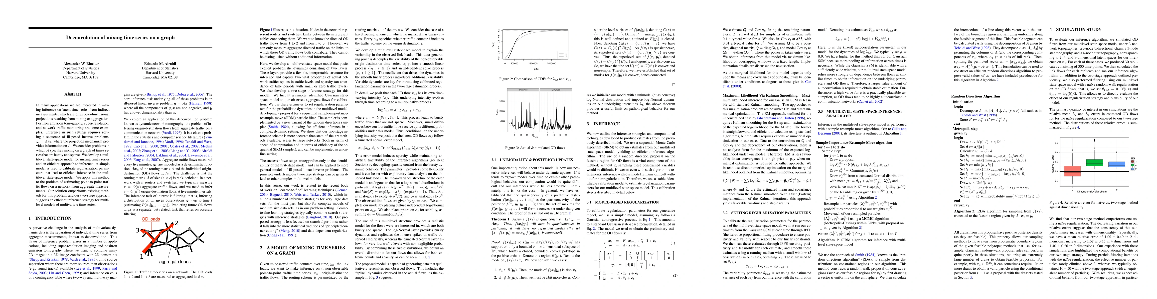 In many applications we are interested in making inference on latent time series from indirect measurements, which are often low-dimensional projections resulting from mixing or aggregation. Positron emission tomography, super-resolution, and network traffic monitoring are some examples. Inference in such settings requires solving a sequence of ill-posed inverse problems, y_t= A x_t, where the projection mechanism provides information on A. We consider problems in which A specifies mixing on a graph of times series that are bursty and sparse. We develop a multilevel state-space model for mixing times series and an efficient approach to inference. A simple model is used to calibrate regularization parameters that lead to efficient inference in the multilevel state-space model. We apply this method to the problem of estimating point-to-point traffic flows on a network from aggregate measurements. Our solution outperforms existing methods for this problem, and our two-stage approach suggests an efficient inference strategy for multilevel models of dependent time series.