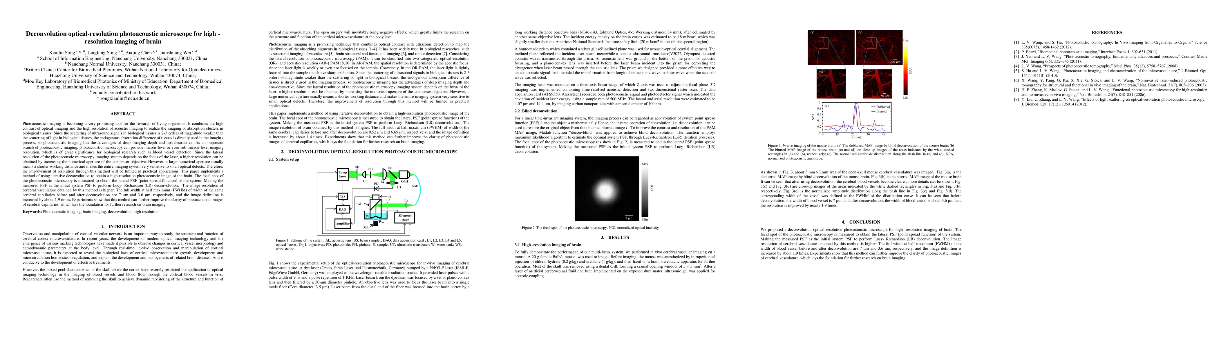 The main technical contribution is the implementation of iterative deconvolution using Lucy-Richardson algorithm to obtain high-resolution photoacoustic images of the brain, utilizing the measured focal spot of the photoacoustic microscopy to determine the system's PSF.