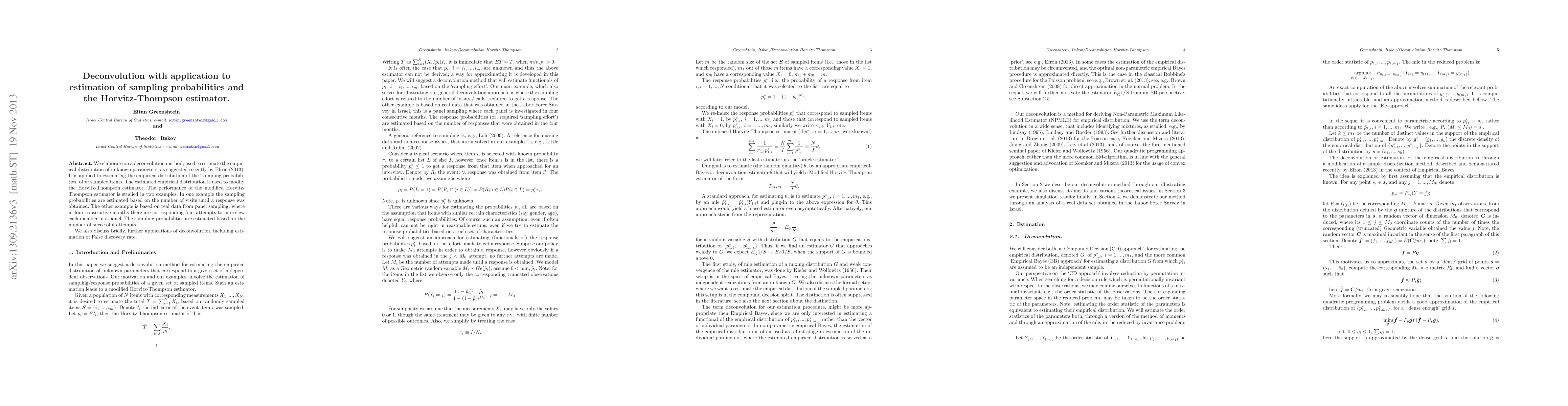 This paper proposes a deconvolution method to estimate the empirical distribution of sampling probabilities, which is then used to refine the Horvitz-Thompson estimator. The method is demonstrated through two examples, one based on visit counts until response and another using panel sampling data, showing potential for broader applications like False Discovery Rate estimation.