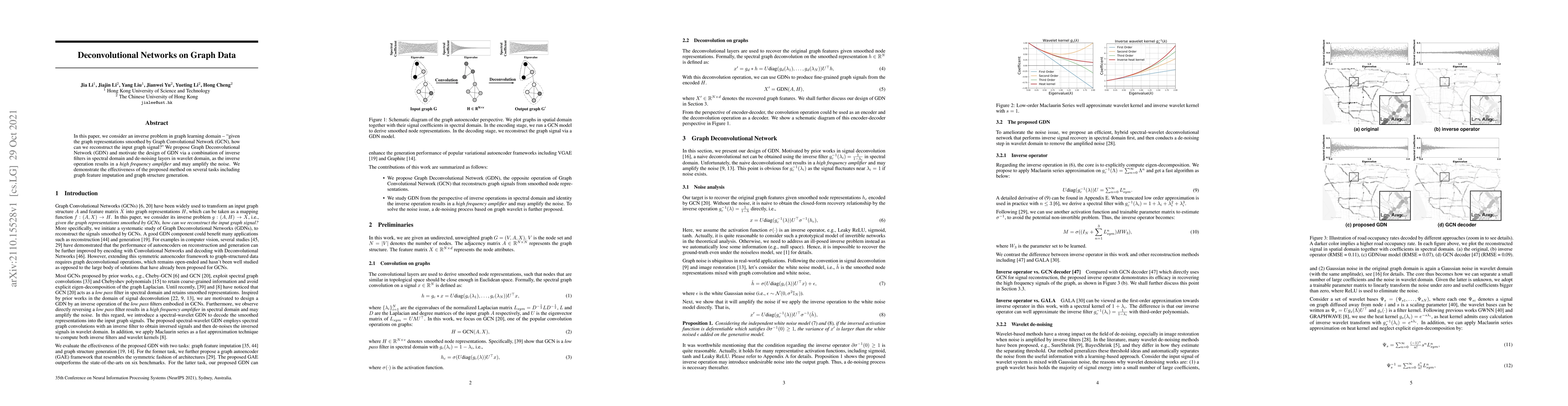 This paper proposes a Graph Deconvolutional Network (GDN) to reconstruct input graph signals from smoothed representations generated by Graph Convolutional Networks. The method combines inverse filtering in the spectral domain and de-noising layers in the wavelet domain to mitigate noise amplification, demonstrating effectiveness in graph feature imputation and structure generation.
