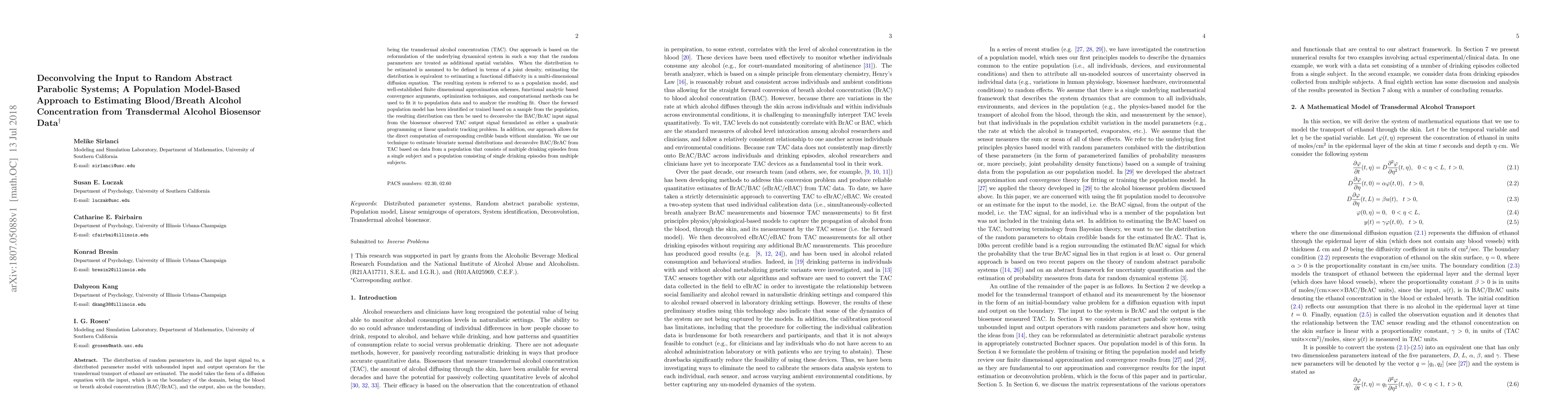 This paper proposes a population model-based approach to estimate blood/breath alcohol concentration (BAC/BrAC) from transdermal alcohol biosensor data by deconvolving the input signal. The model reformulates the random parameters as additional spatial variables in a multi-dimensional diffusion equation, allowing for the estimation of a functional diffusivity and the computation of credible bands without simulation.