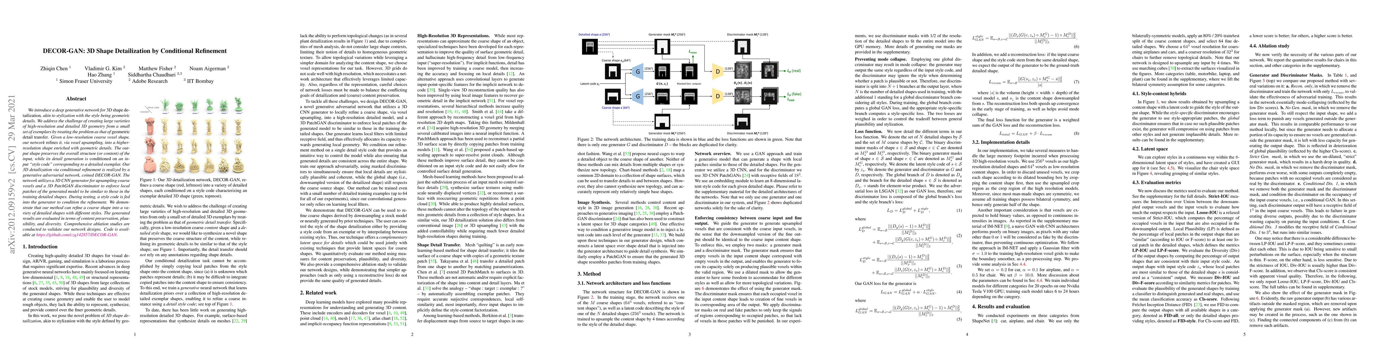DECOR-GAN is a deep generative network that refines low-resolution 3D shapes into high-resolution detailed models by transferring geometric details from exemplars. It uses a 3D CNN generator and a PatchGAN discriminator to ensure content preservation and detail plausibility.