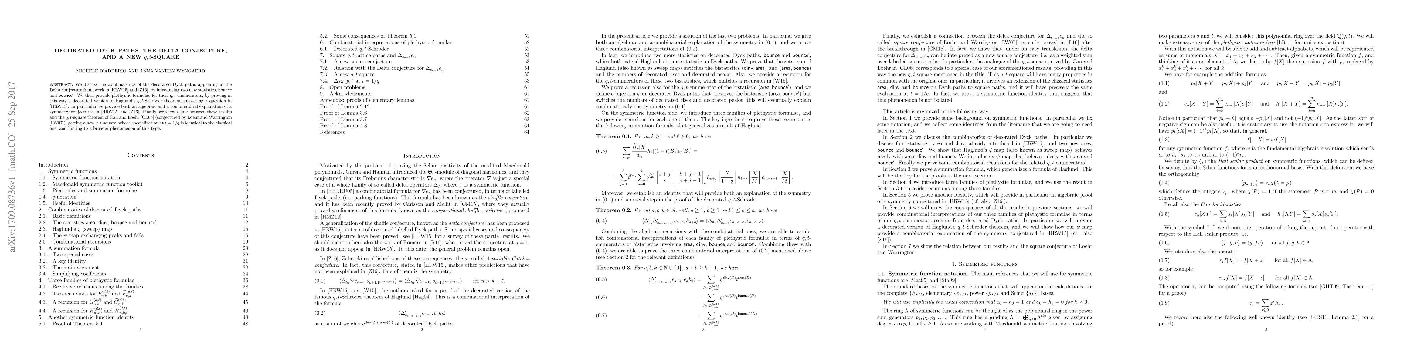 We discuss the combinatorics of the decorated Dyck paths appearing in the Delta conjecture framework of Haglund, Remmel and Wilson (2015) and Zabrocki (2016), by introducing two new statistics, bounce and bounce'. We then provide plethystic formulae for their q,t-enumerators, by proving in this way a decorated version of Haglund's q,t-Schroeder theorem, answering a question in Haglund, Remmel and Wilson (2015). In particular we provide both an algebraic and a combinatorial explanation of a symmetry conjectured in Haglund, Remmel and Wilson (2015) and Zabrocki (2016). Finally, we show a link between these results and the q,t-square theorem of Can and Loehr (2006) (conjectured by Loehr and Warrington (2007)), getting a new q,t-square, whose specialization at t=1/q is identical to the classical one, and hinting to a broader phenomenon of this type.