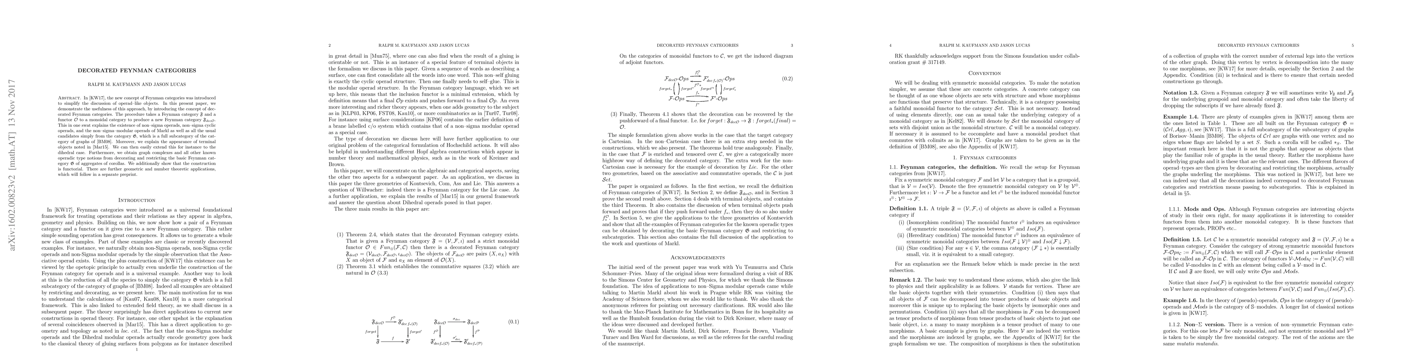 In [KW14], the new concept of Feynman categories was introduced to simplify the discussion of operad--like objects. In this present paper, we demonstrate the usefulness of this approach, by introducing the concept of decorated Feynman categories. The procedure takes a Feynman category $\mathfrak F$ and a functor $\mathcal O$ to a monoidal category to produce a new Feynman category ${\mathfrak F}_{dec {\mathcal O}}$. This in one swat explains the existence of non--sigma operads, non--sigma cyclic operads, and the non--sigma--modular operads of Markl as well as all the usual candidates simply from the category $\mathfrak G$, which is a full subcategory of the category of graphs of [BM08]. Moreover, we explain the appearance of terminal objects noted in [Mar15]. We can then easily extend this for instance to the dihedral case. Furthermore, we obtain graph complexes and all other known operadic type notions from decorating and restricting the basic Feynman category $\mathfrak G$ of aggregates of corollas. We additionally show that the construction is functorial. There are further geometric and number theoretic applications, which will follow in a separate preprint.