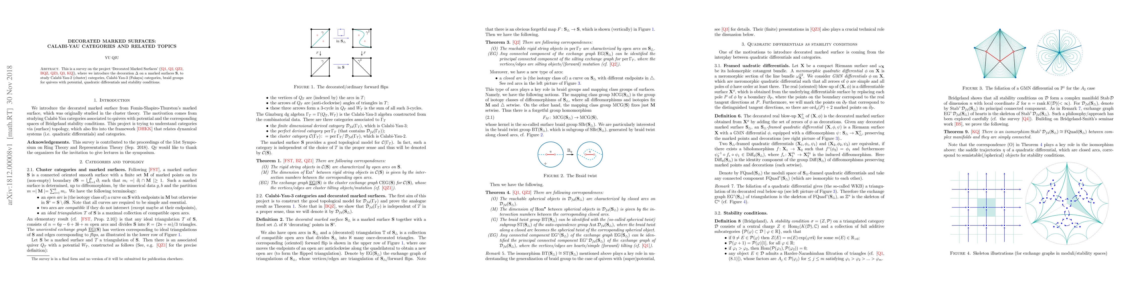 This is a survey on the project `Decorated Marked Surfaces', where we introduce the decoration $\Delta$ on a marked surfaces $\mathbf{S}$, to study Calabi-Yau-2 (cluster) categories, Calabi-Yau-3 (Fukaya) categories, braid groups for quivers with potential, quadratic differentials and stability conditions.