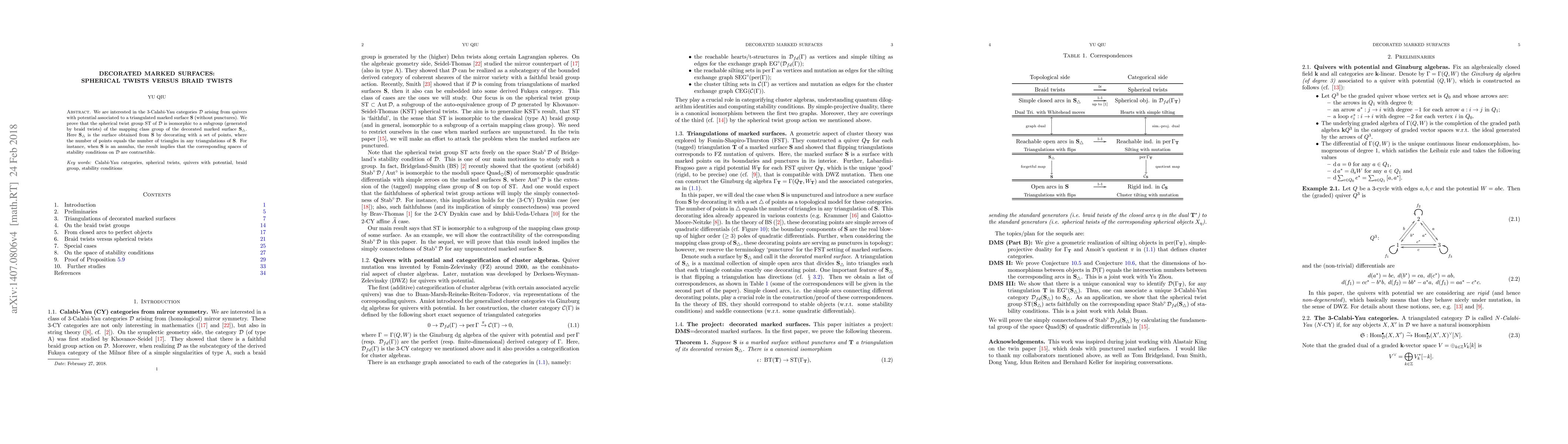 This paper investigates 3-Calabi-Yau categories derived from marked surfaces and proves that the spherical twist group is isomorphic to a subgroup of the mapping class group generated by braid twists. It demonstrates that for certain surfaces like annuli, the spaces of stability conditions on these categories are contractible.