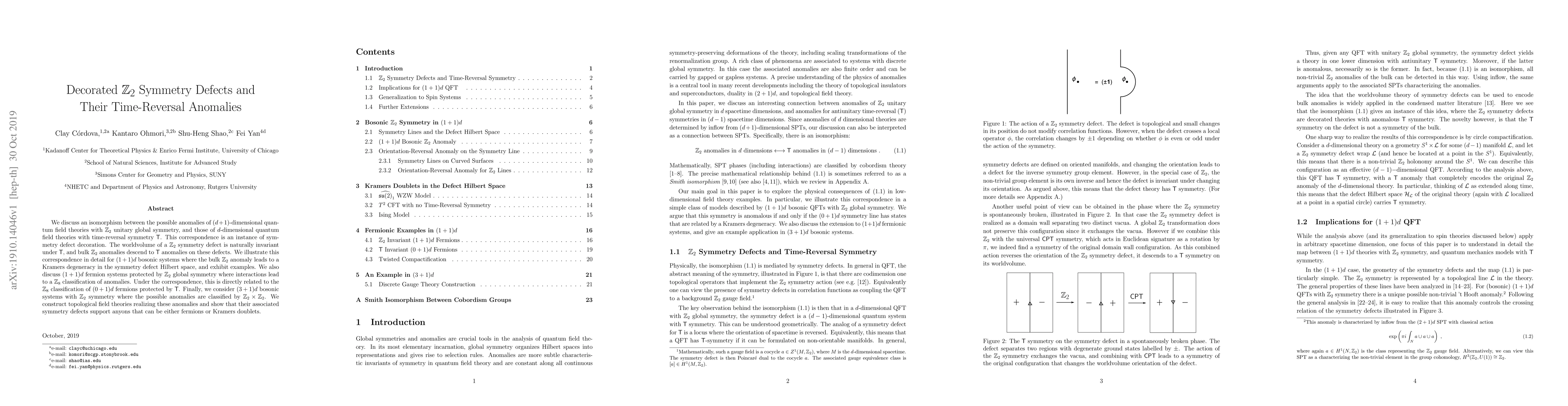 We discuss an isomorphism between the possible anomalies of $(d+1)$-dimensional quantum field theories with $\mathbb{Z}_{2}$ unitary global symmetry, and those of $d$-dimensional quantum field theories with time-reversal symmetry $\mathsf{T}$. This correspondence is an instance of symmetry defect decoration. The worldvolume of a $\mathbb{Z}_{2}$ symmetry defect is naturally invariant under $\mathsf{T},$ and bulk $\mathbb{Z}_{2}$ anomalies descend to $\mathsf{T}$ anomalies on these defects. We illustrate this correspondence in detail for $(1+1)d$ bosonic systems where the bulk $\mathbb{Z}_{2}$ anomaly leads to a Kramers degeneracy in the symmetry defect Hilbert space, and exhibit examples. We also discuss $(1+1)d$ fermion systems protected by $\mathbb{Z}_{2}$ global symmetry where interactions lead to a $\mathbb{Z}_{8}$ classification of anomalies. Under the correspondence, this is directly related to the $\mathbb{Z}_{8}$ classification of $(0+1)d$ fermions protected by $\mathsf{T}$. Finally, we consider $(3+1)d$ bosonic systems with $\mathbb{Z}_{2}$ symmetry where the possible anomalies are classified by $\mathbb{Z}_{2}\times \mathbb{Z}_{2}$. We construct topological field theories realizing these anomalies and show that their associated symmetry defects support anyons that can be either fermions or Kramers doublets.