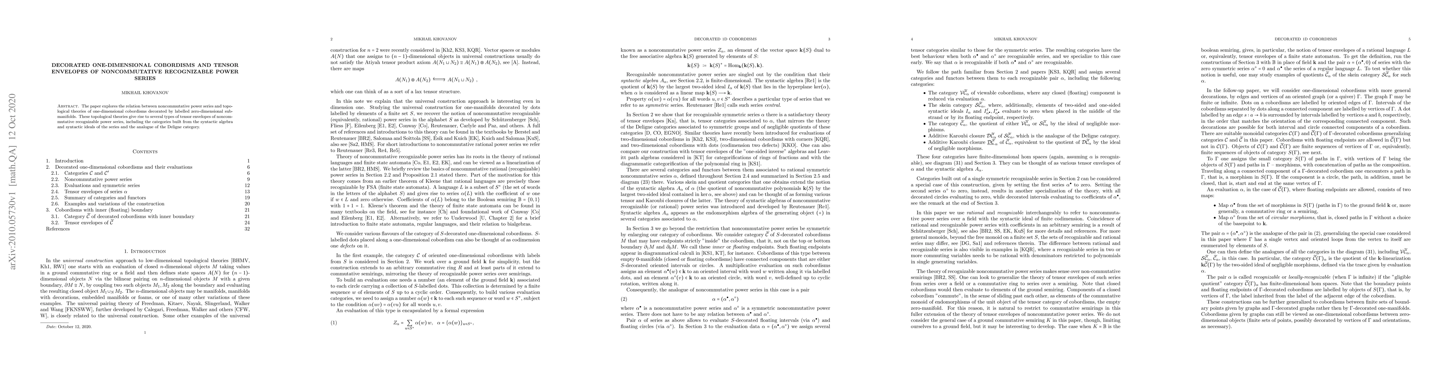 The paper investigates the connection between noncommutative power series and topological theories of one-dimensional cobordisms marked by zero-dimensional submanifolds. It introduces various tensor envelopes of noncommutative recognizable power series, such as those derived from syntactic algebras and Deligne-like categories.