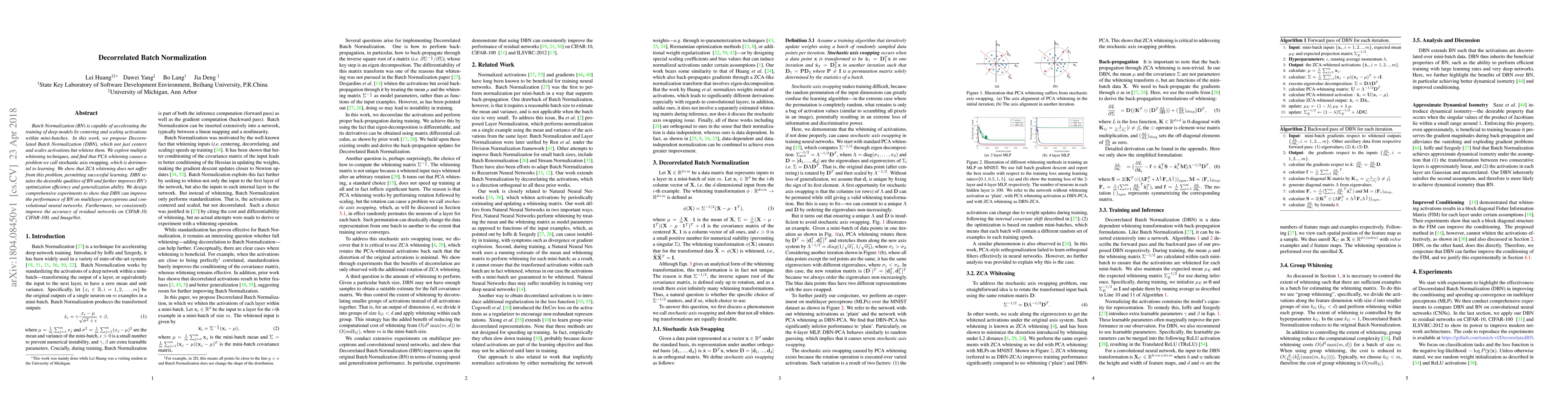 Decorrelated Batch Normalization (DBN) enhances Batch Normalization (BN) by whitening activations, improving optimization efficiency and generalization. ZCA whitening avoids stochastic axis swapping, leading to better performance on multilayer perceptrons, convolutional neural networks, and residual networks on CIFAR-10, CIFAR-100, and ImageNet.