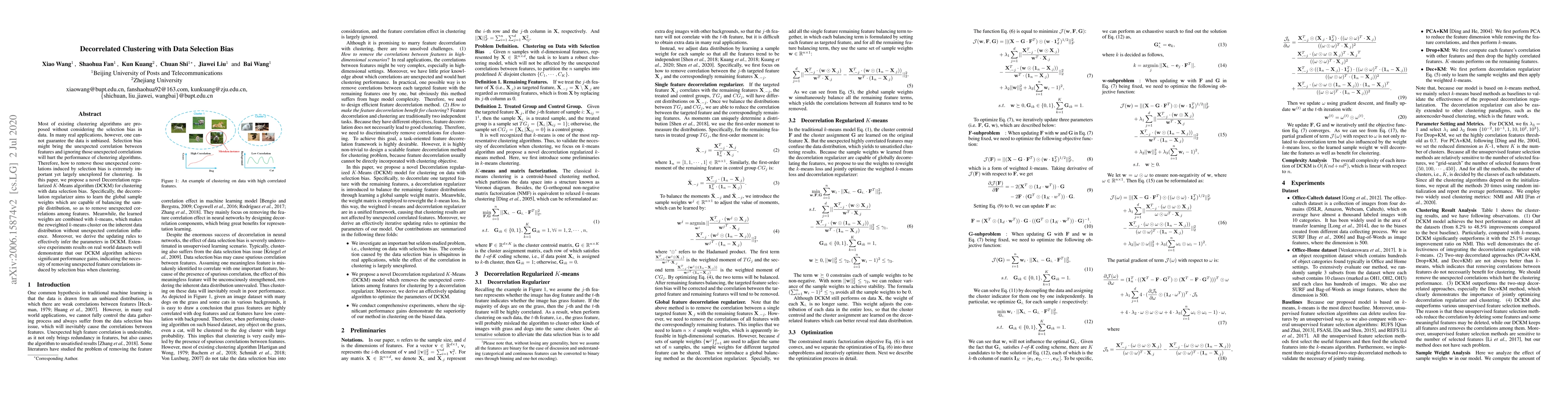 This paper proposes a novel Decorrelation regularized K-Means algorithm (DCKM) to address clustering in the presence of data selection bias, which introduces unexpected feature correlations. The method learns global sample weights to balance the sample distribution and removes these correlations, significantly improving clustering performance.